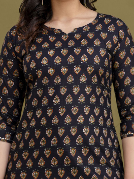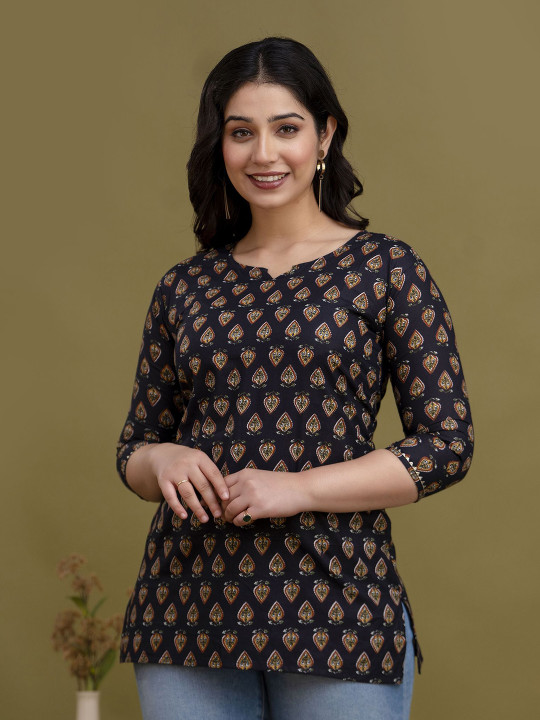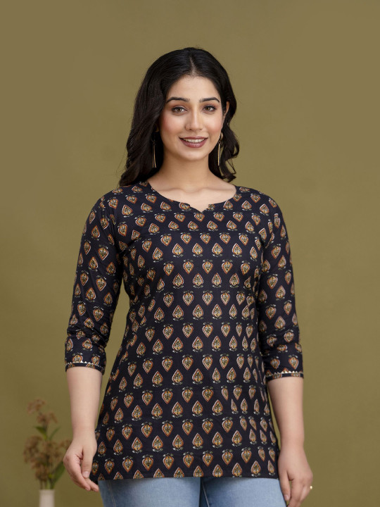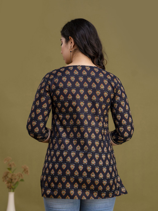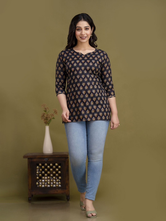 Black Printed Top Cotton Short Kurti Tunic for Women