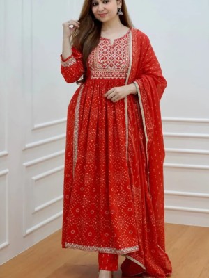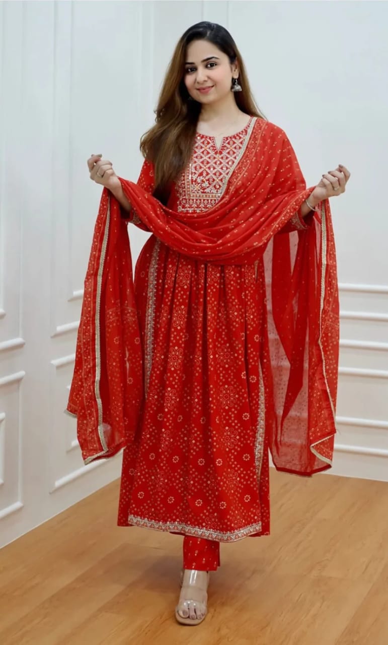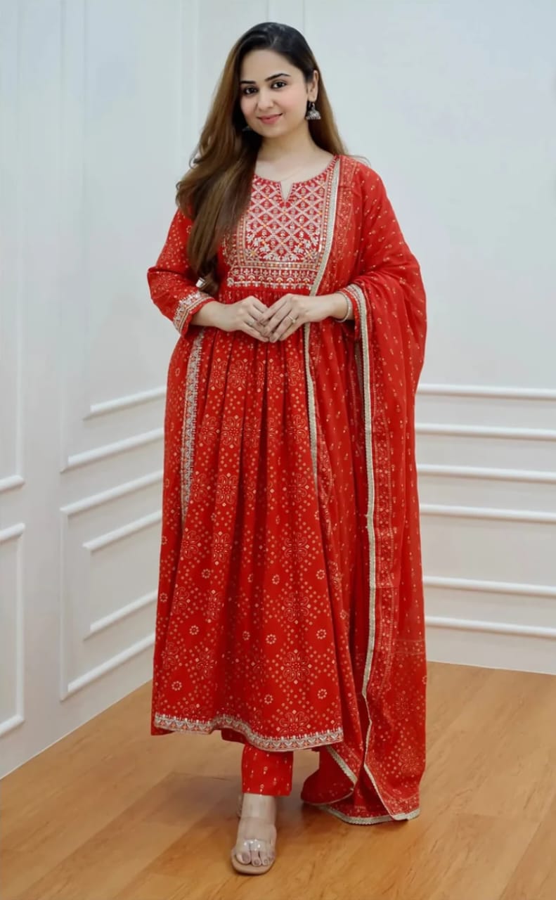 Red Nayra Cut Straight Kurti with Pant & Dupatta Indian Salwar Kameez Suit Set