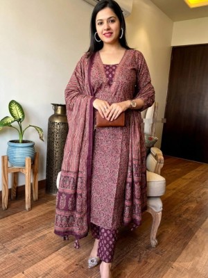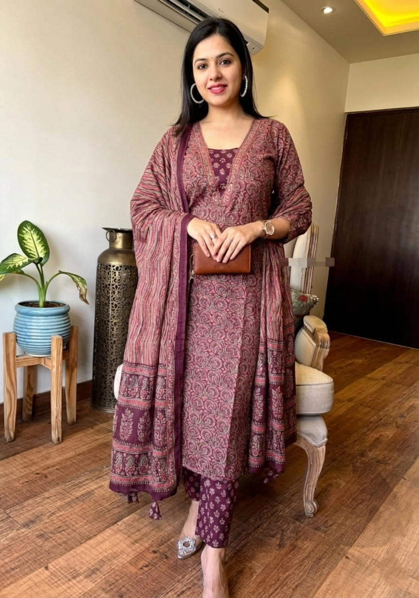 Seerat Floral Ajrakh Printed Indian Straight Kurti with Pant and Dupatta Salwar Kameez Set
