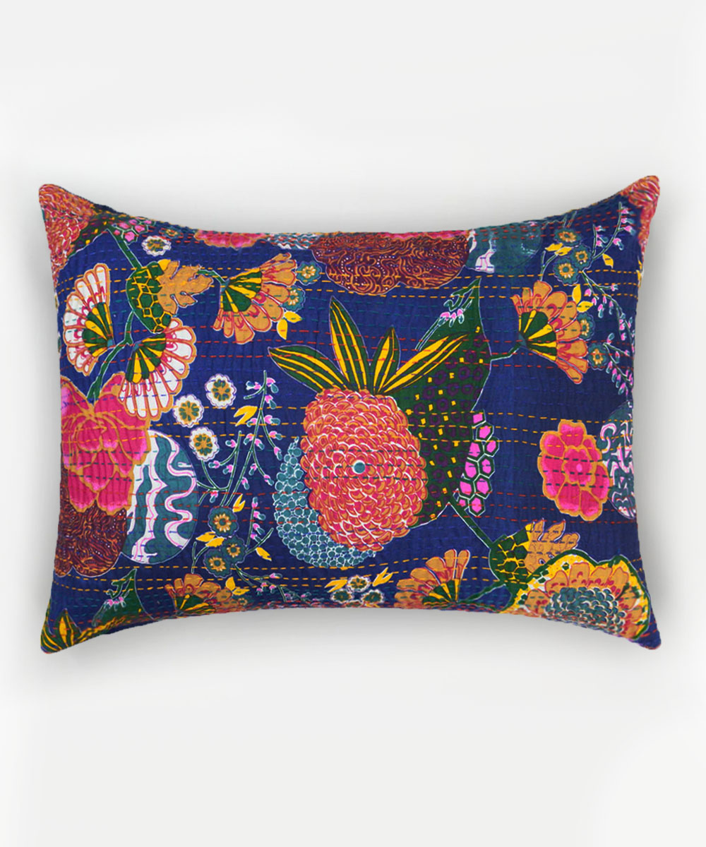 Dark Blue Multi Tropicana Bohemian Kantha Quilted Standard Size Pillow Cover Set of Two