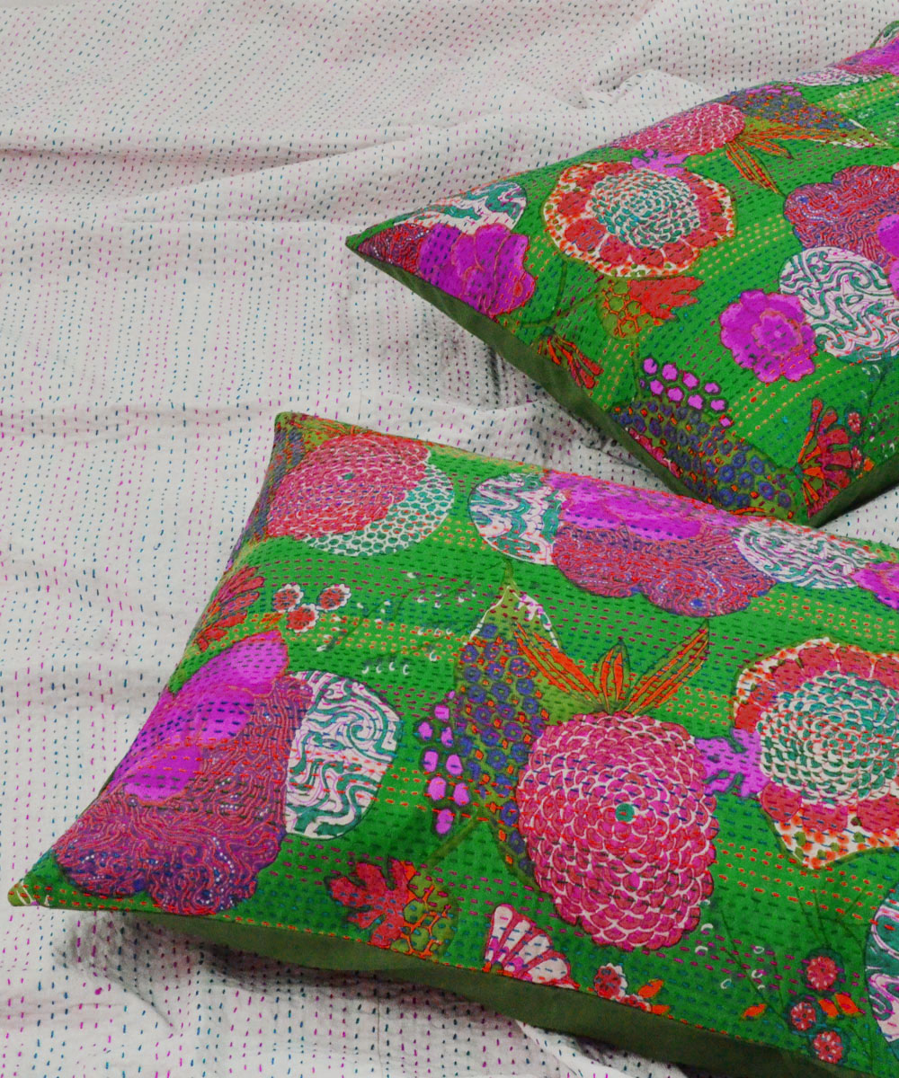 Green Multi Tropicana Bohemian Kantha Quilted Standard Size Pillow Cover Set of Two