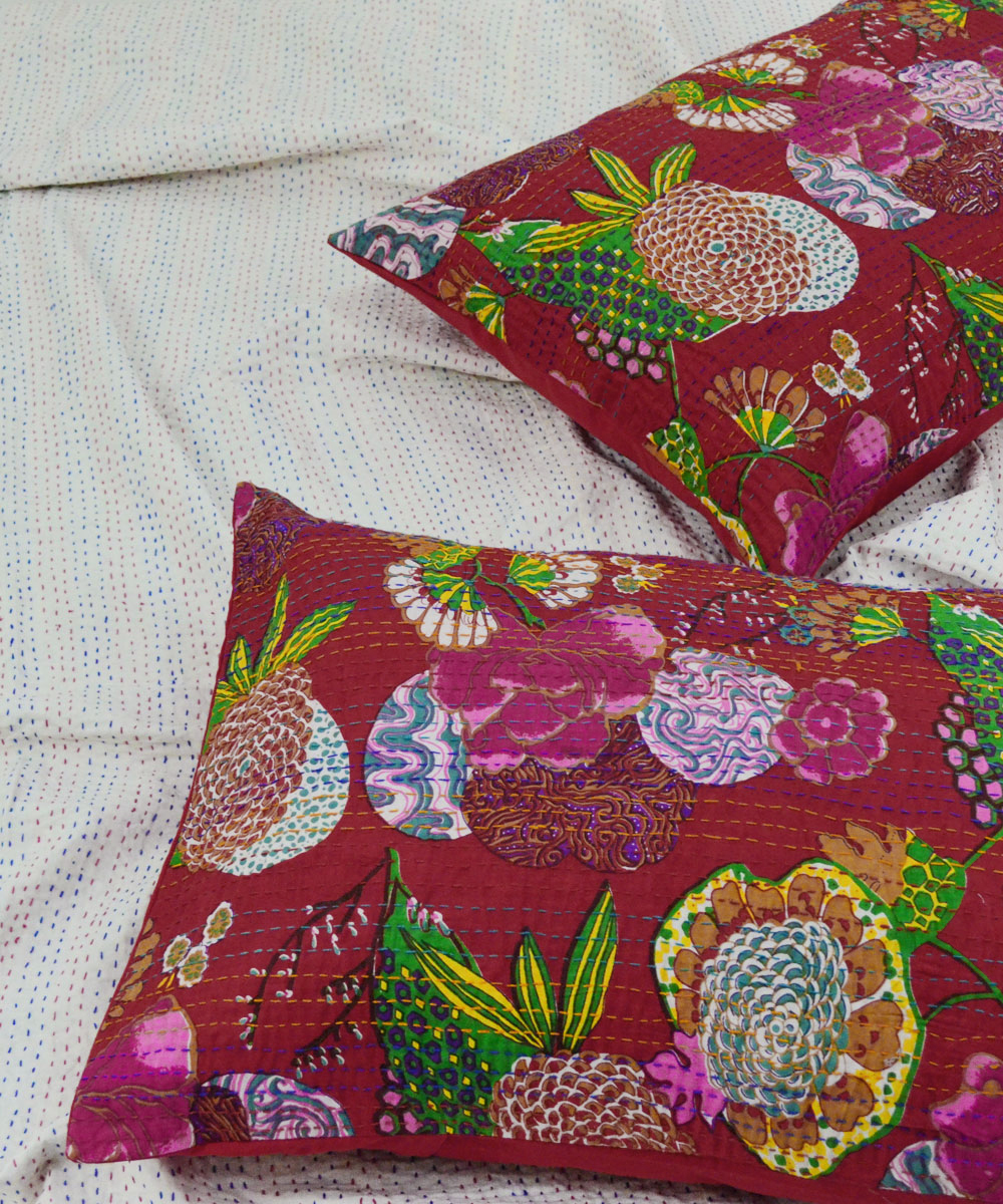 Maroon Multi Tropicana Bohemian Kantha Quilted Standard Size Pillow Cover Set of Two