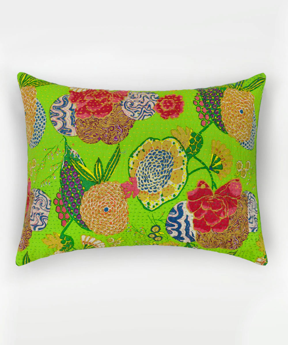 Parrot Green Multi Tropicana Bohemian Kantha Quilted Standard Size Pillow Cover Set of Two