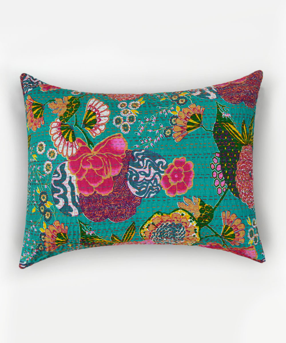 Teal Multi Tropicana Bohemian Kantha Quilted Standard Size Pillow Cover Set of Two