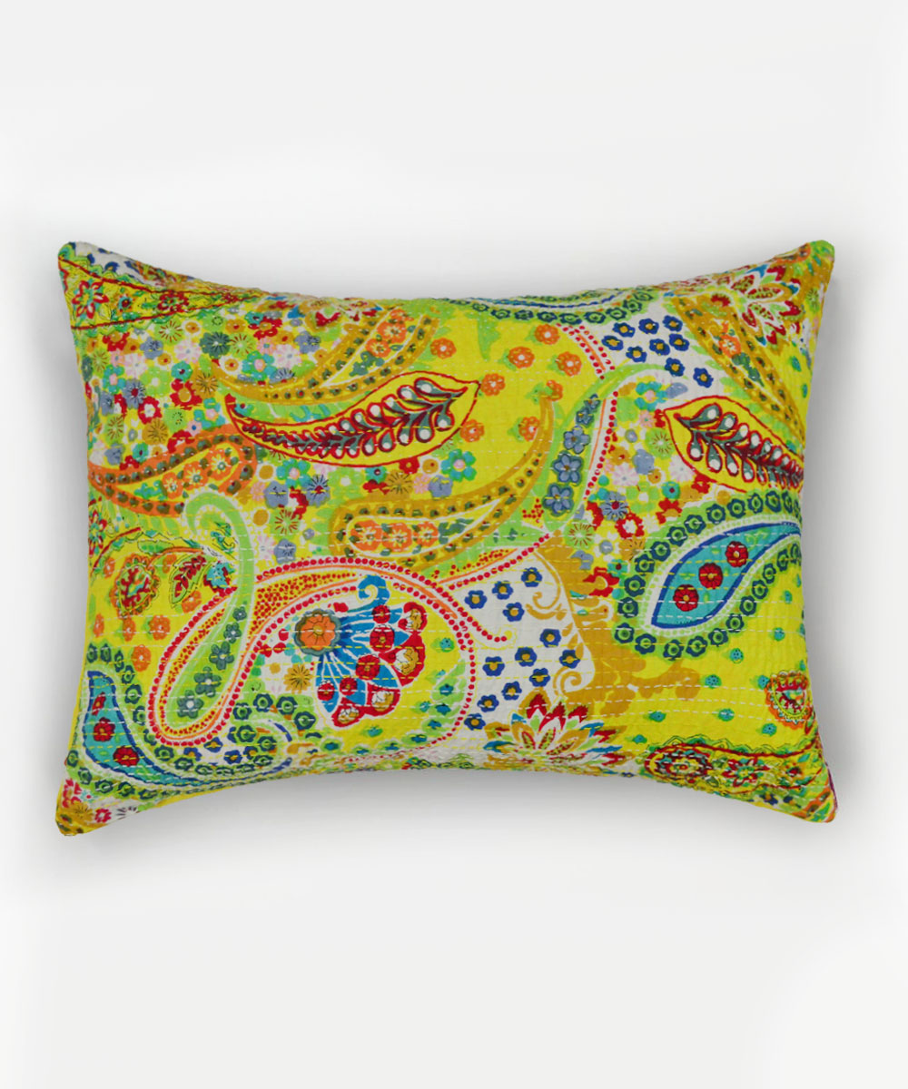 Yellow Multicolored Paisley Printed Bohemian Kantha Quilted Standard Size Pillowcase - Set of Two
