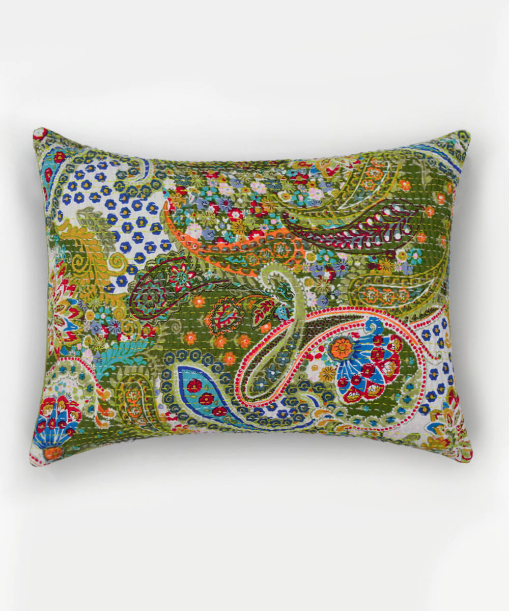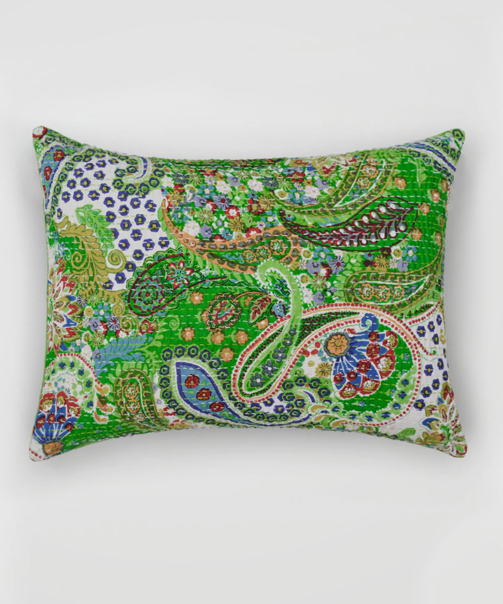 Green Multi Multicolored Paisley Printed Bohemian Kantha Quilted Standard Size Pillowcase - Set of Two