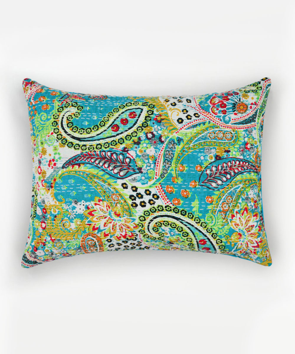 Turquoise Multicolored Paisley Printed Bohemian Kantha Quilted Standard Size Pillowcase - Set of Two
