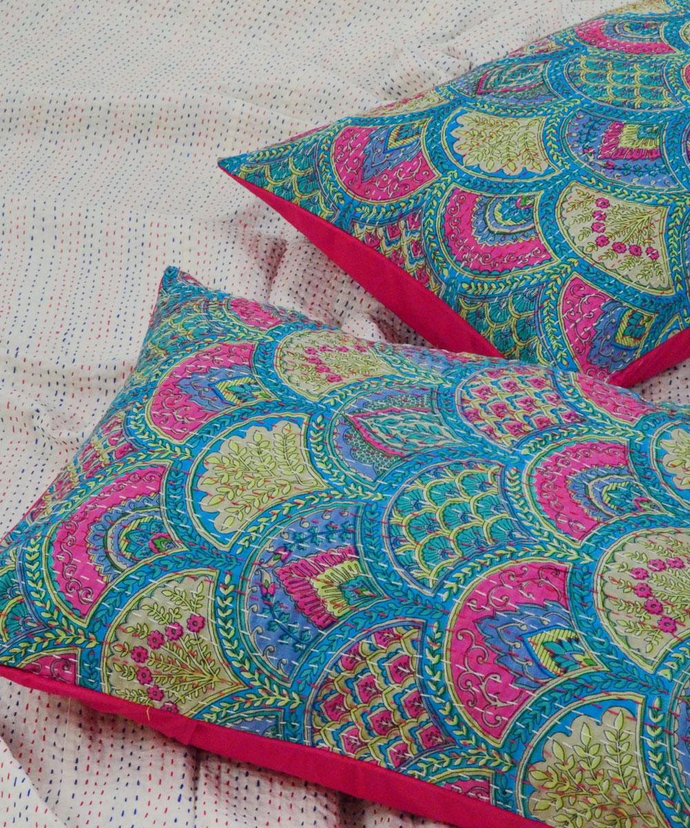 Pink Bohochic Cotton Sea Wave Designer Handmade Kantha Standard Pillow Sham Set of 2