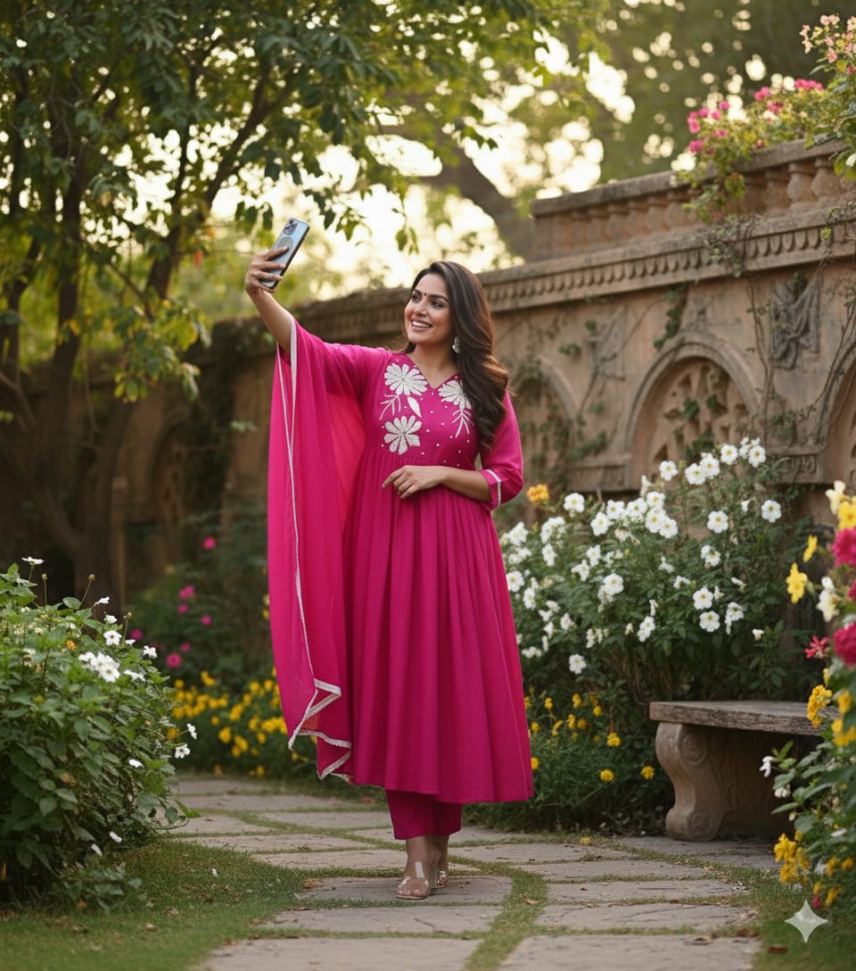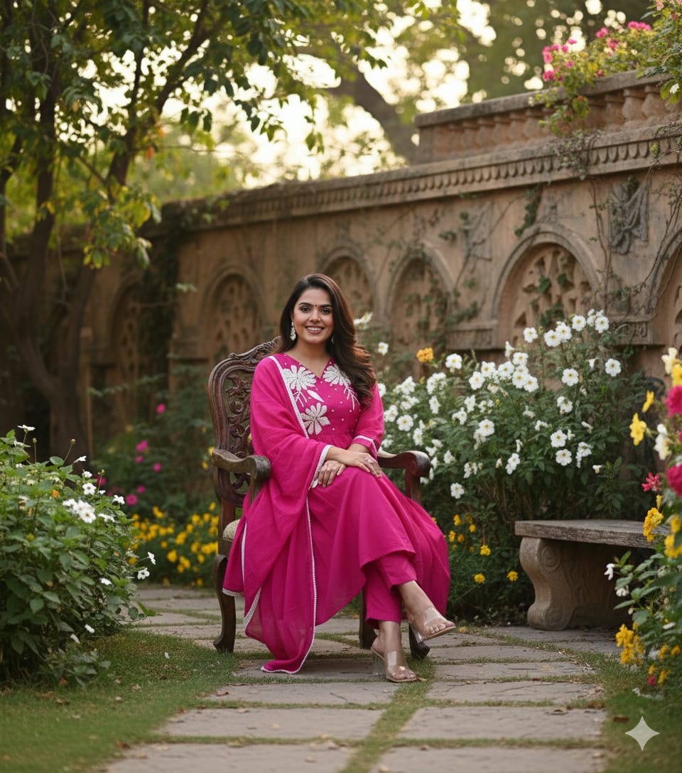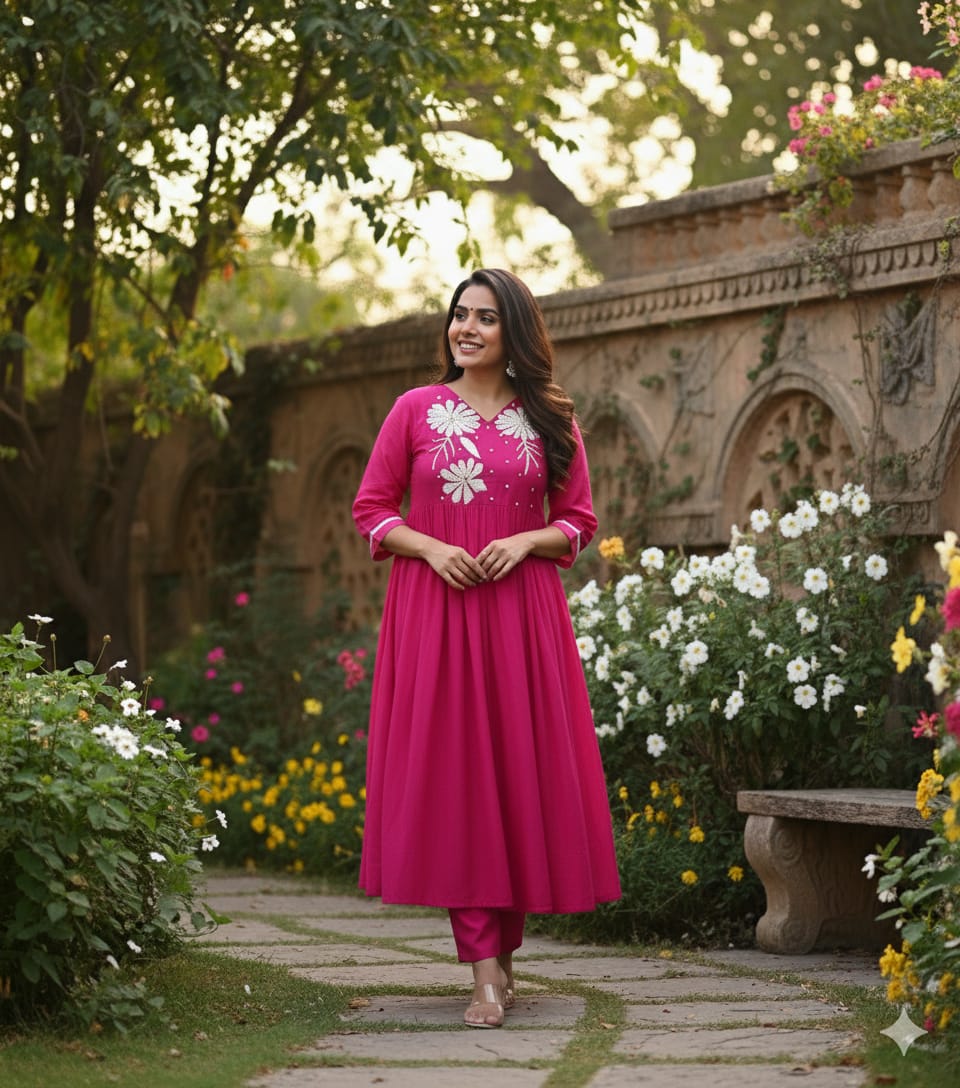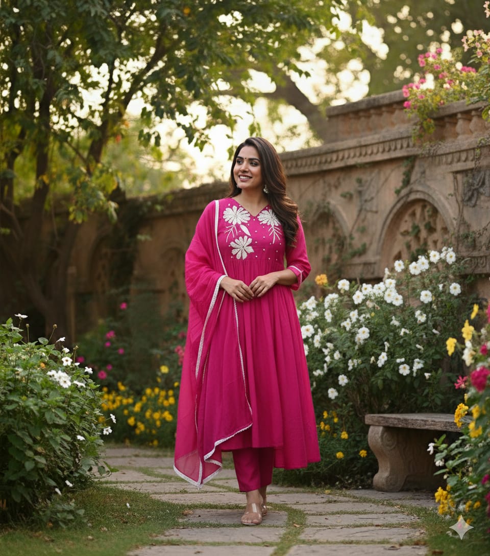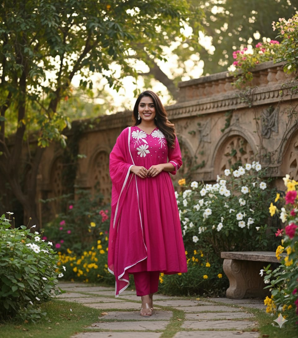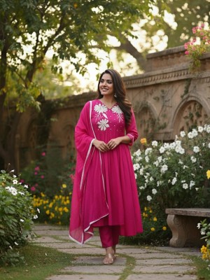 Manya Pink Floral Embroidered Anarkali Kurti Pant Dupatta Set Salwar Kameez Dress (Set of 3)