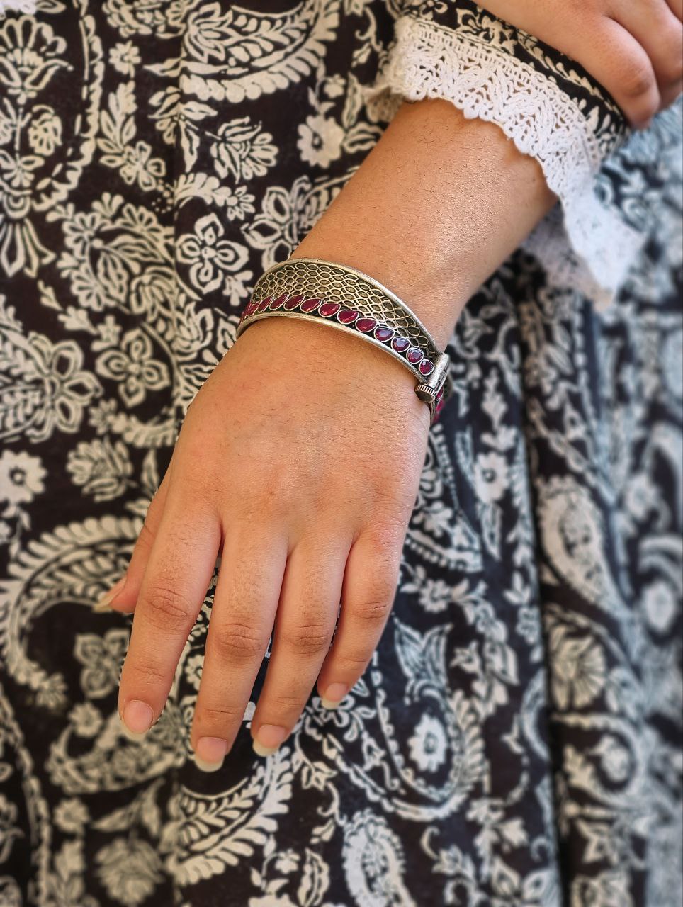 Red Unique Vintage Theme Openable Kada Bracelet Silver Oxidized Stone Work Bangle