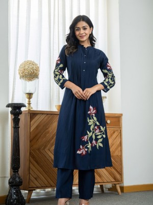 Elevate your ethnic wardrobe with this elegant Navy Blue readymade co ord set featuring intricate embroidery work and pintex patterns. The kurti is designed for a flattering fit, paired perfectly with matching pants for a coordinated look. Crafted from comfortable, breathable fabric, it is ideal for festive occasions, office wear, or casual gatherings. This two piece salwar kameez set blends traditional charm with modern style effortlessly. Perfect for women who love timeless elegance.
