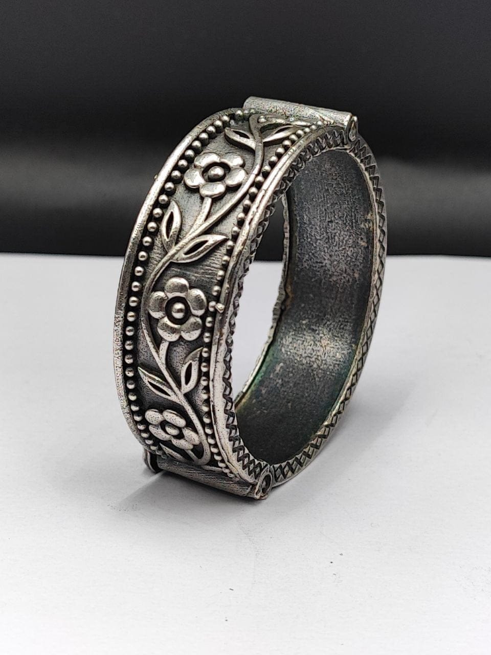 Vintage Tribal Rustic Silver Oxidised Openable Bracelet Flower Designer Kada Bangle