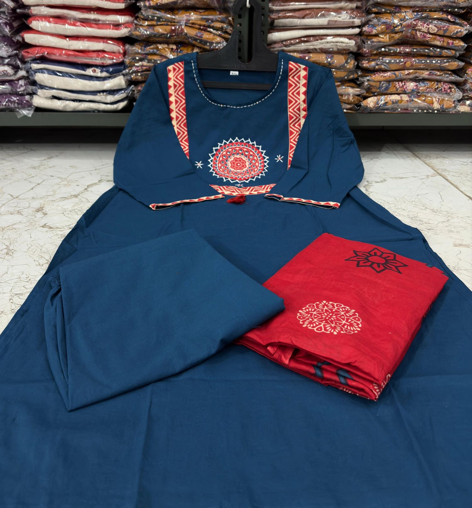 Elevate your ethnic charm with this Blue Designer Readymade Straight Salwar Kameez Set for Women. Crafted from premium cotton fabric, the kurti features intricate print that adds elegance and sophistication. Paired with matching pants and a dupatta, this set ensures a complete festive look. Perfect for weddings, parties, or festive occasions, it offers a blend of comfort and traditional style that enhances your graceful appearance effortlessly.