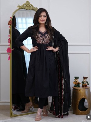 Kusum Black V-Neck Ethnic Embroidered Indian Salwar Kameez Kurti Pant Dupatta Set for Women - Set of 3