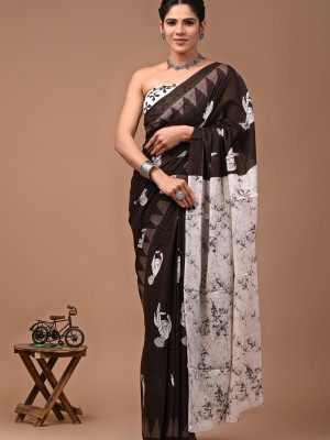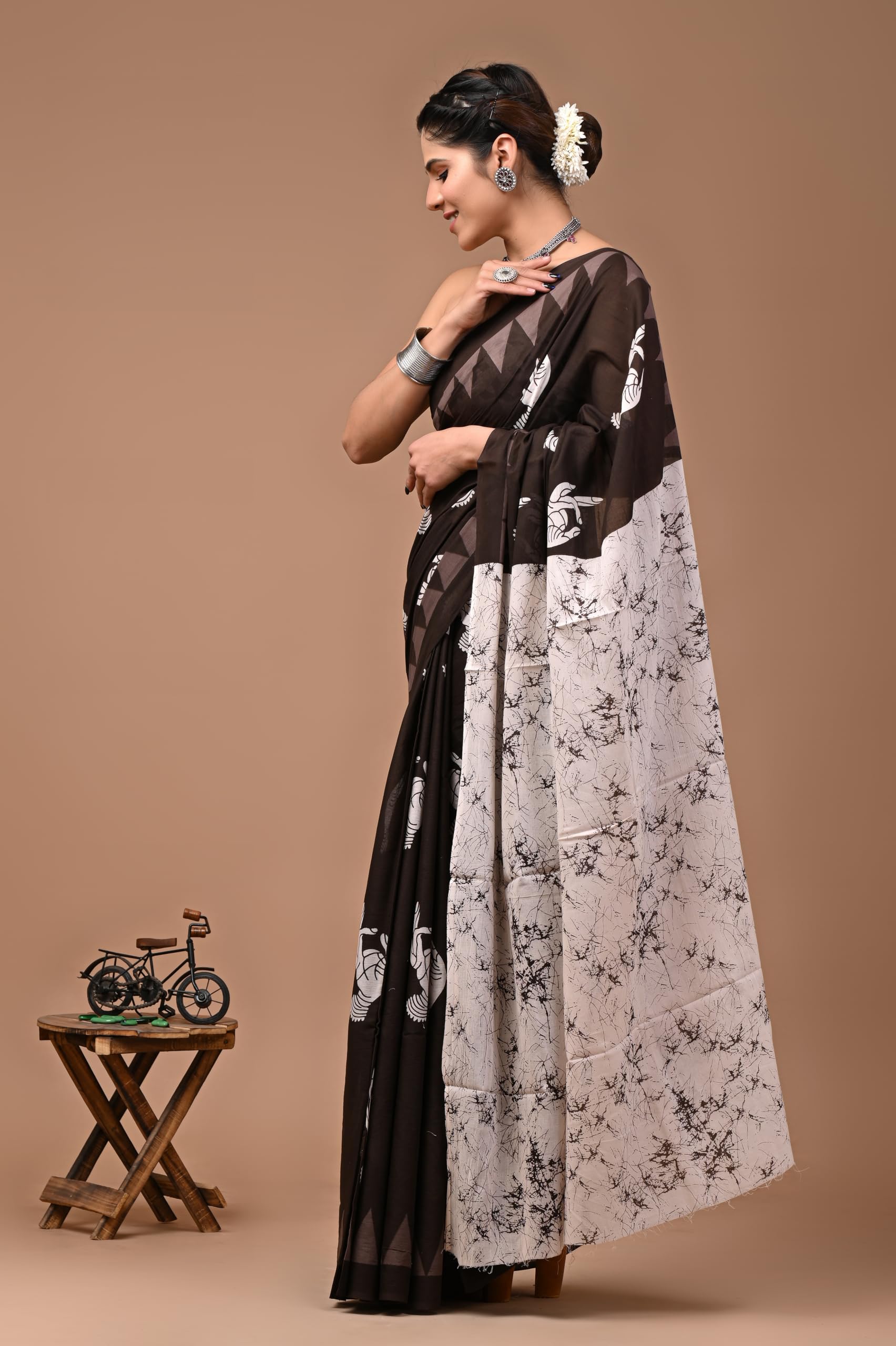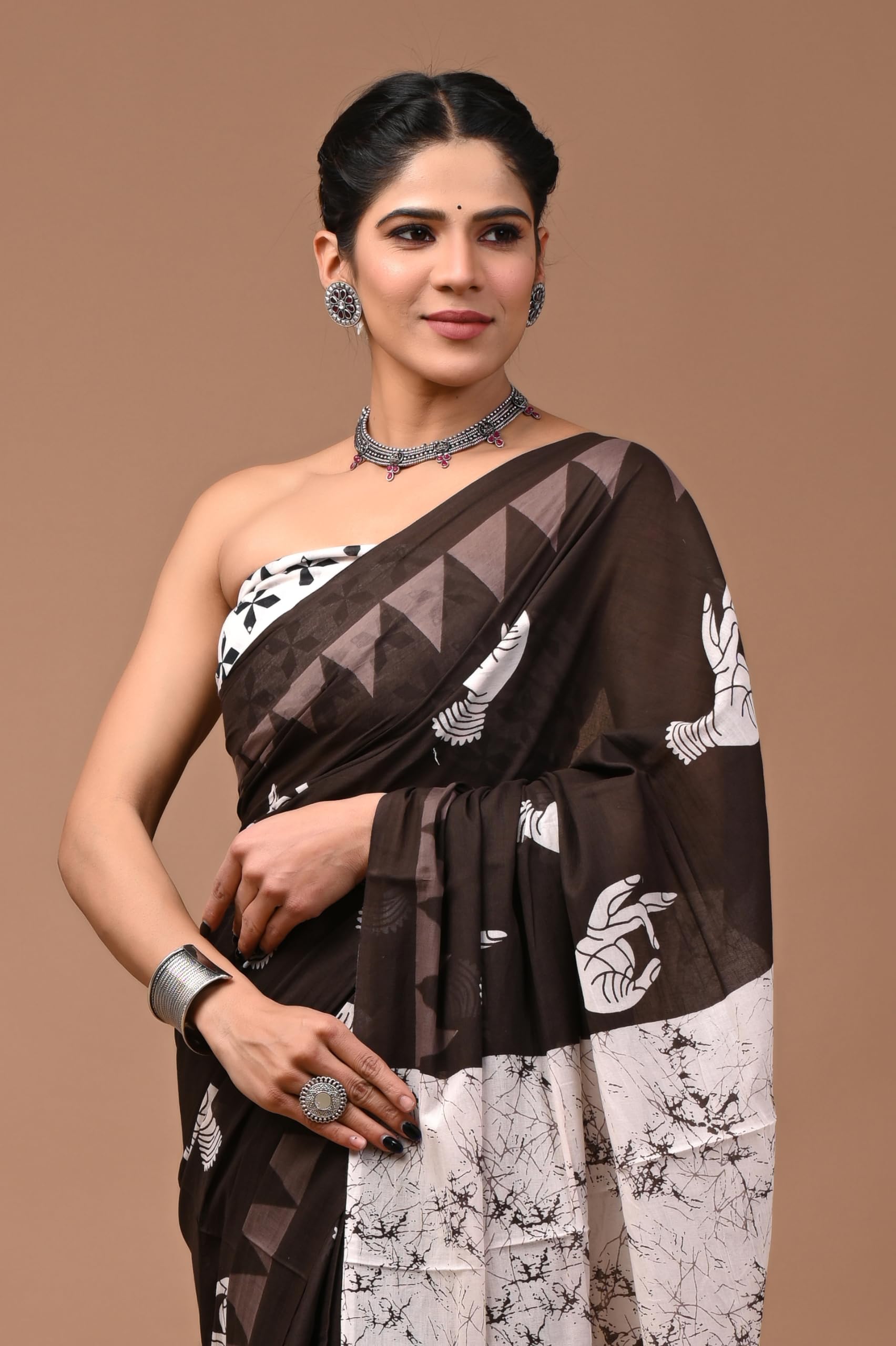 Indira Black & White Sangaeri Printed Cotton Mulmul Saree with Blouse Piece