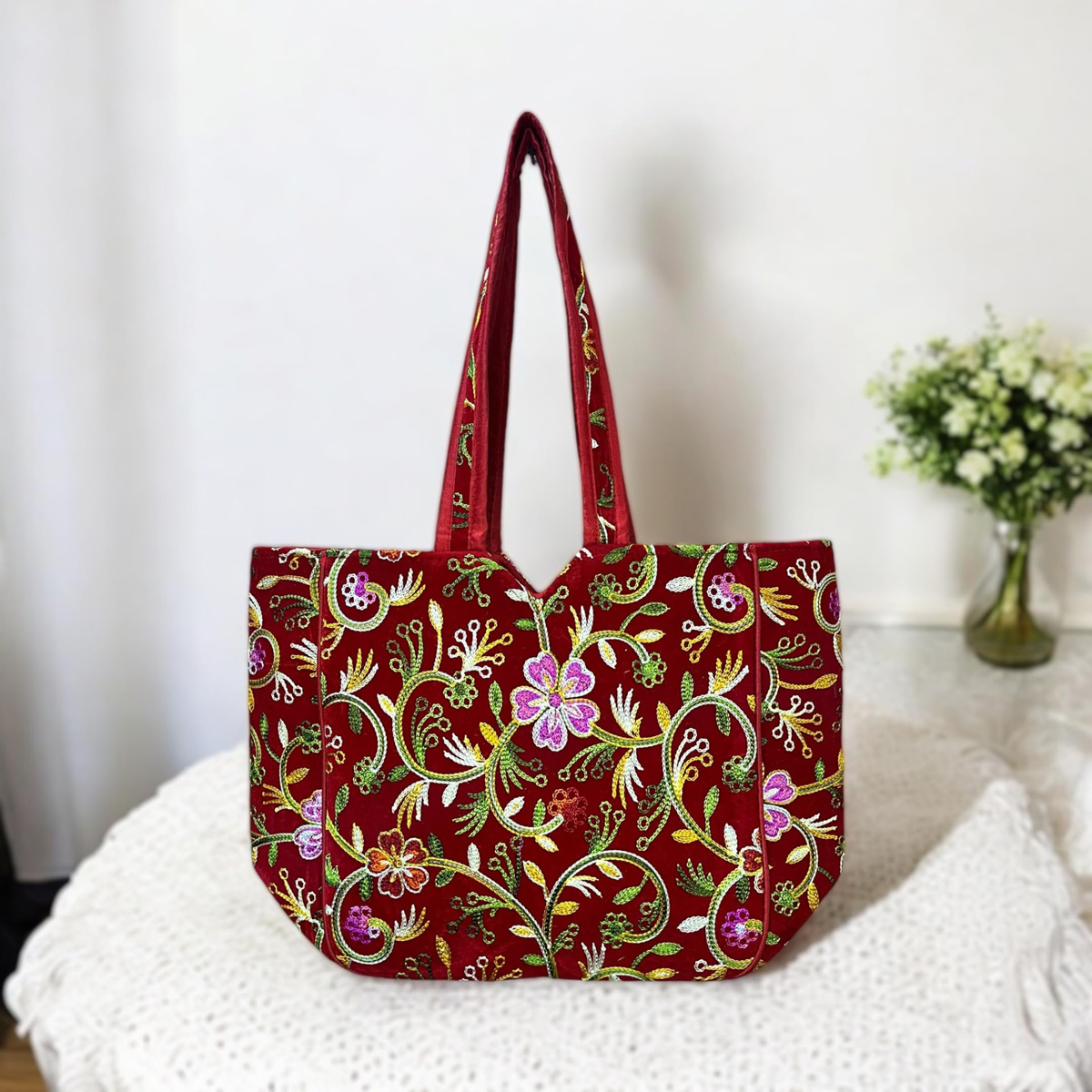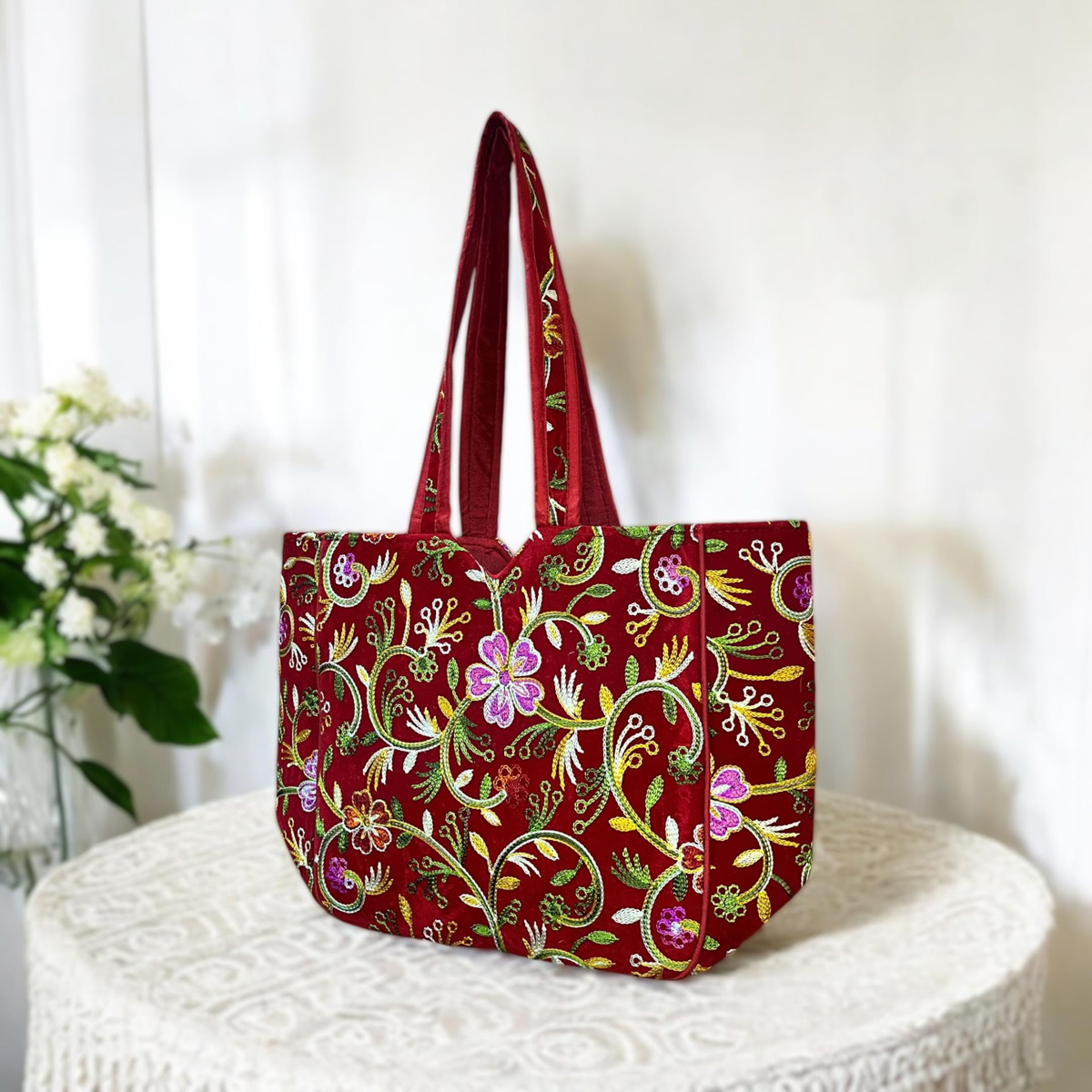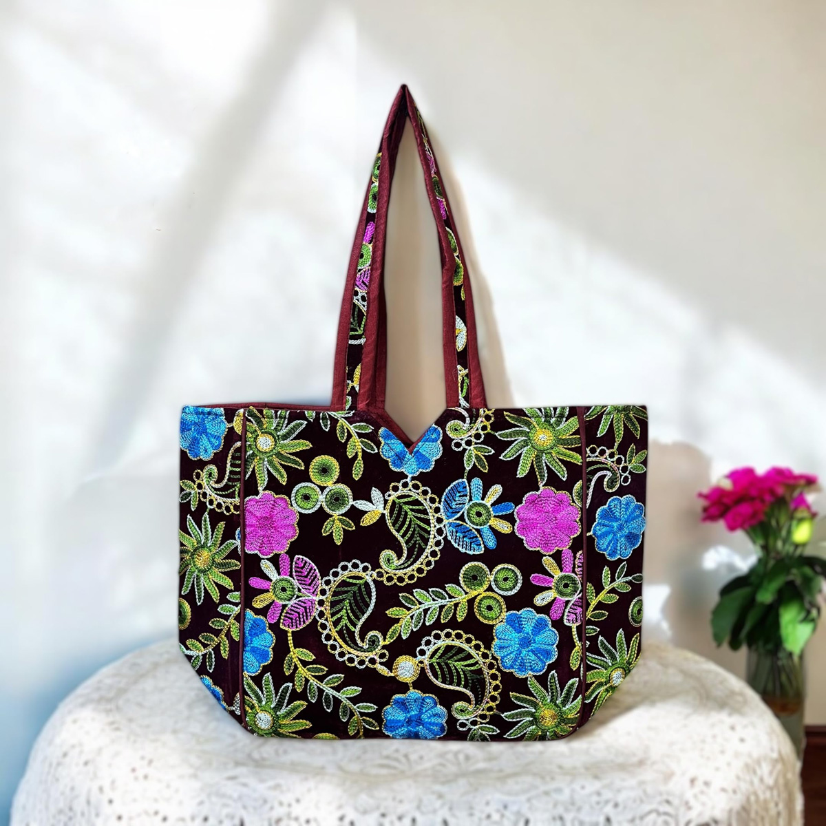 Maroon Kashmiri Flower Embroidered Tote Bag Indian Handicrafted Boho Bag