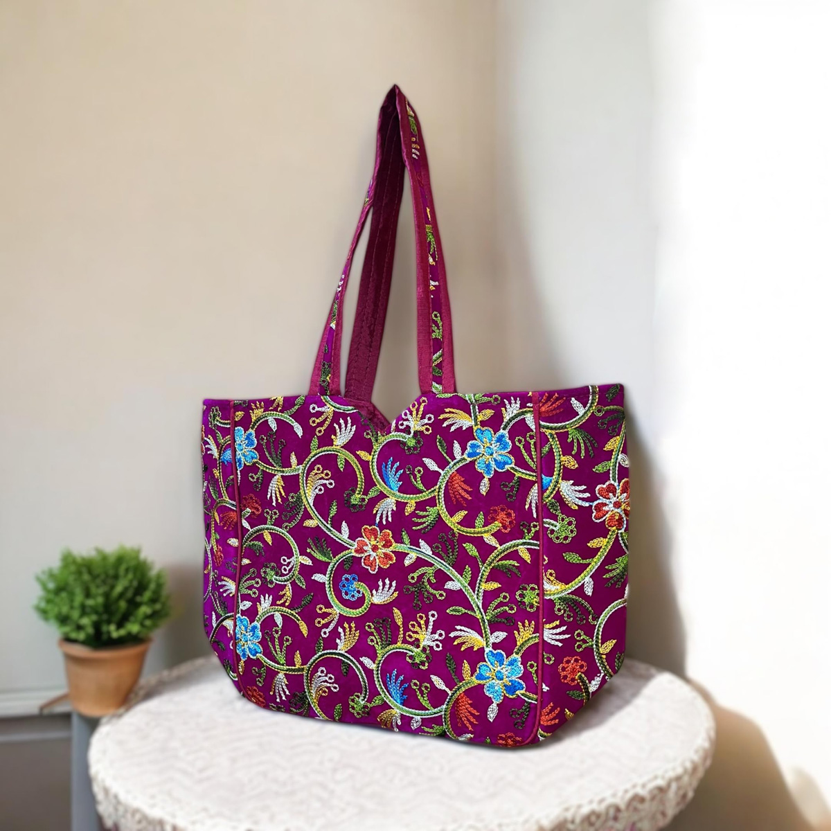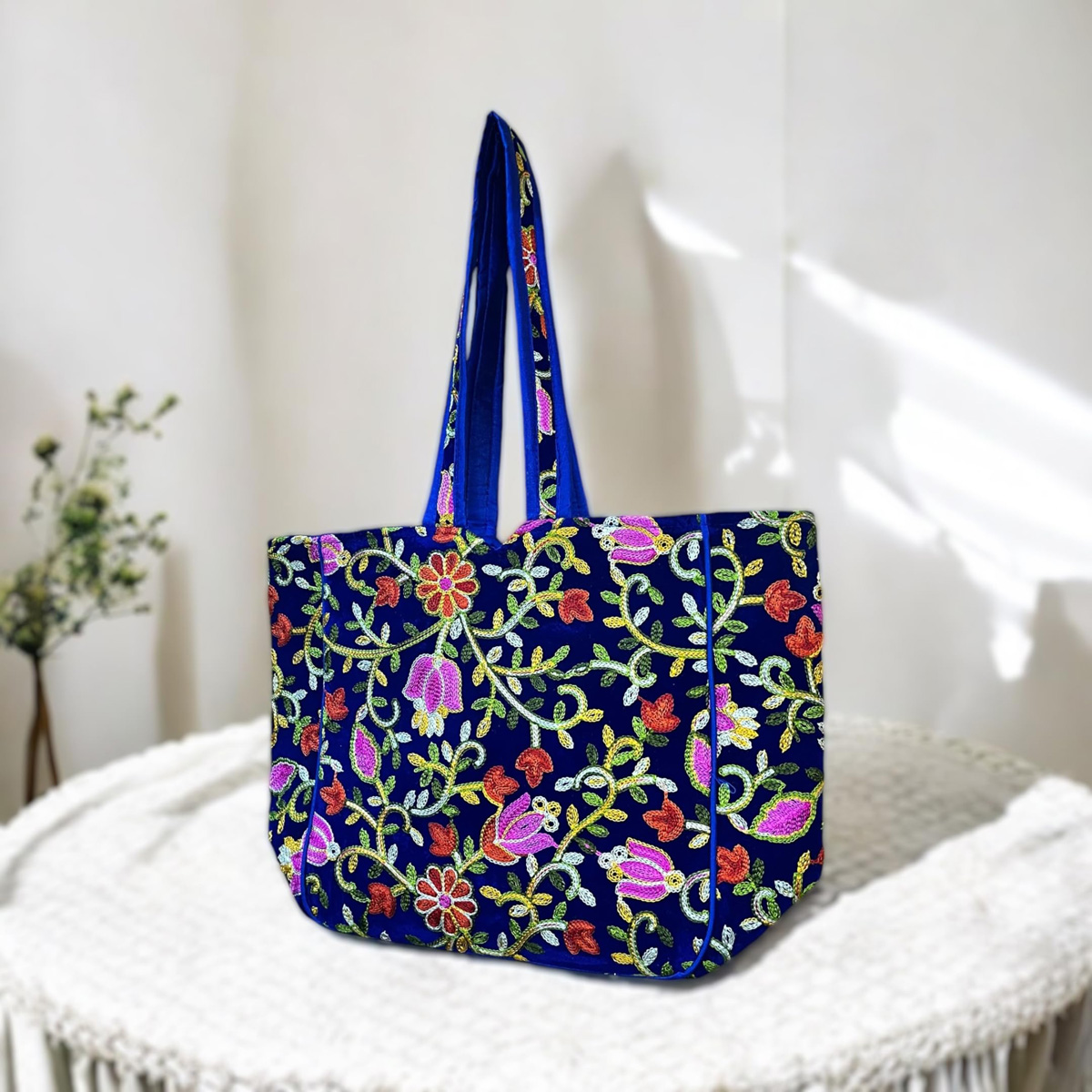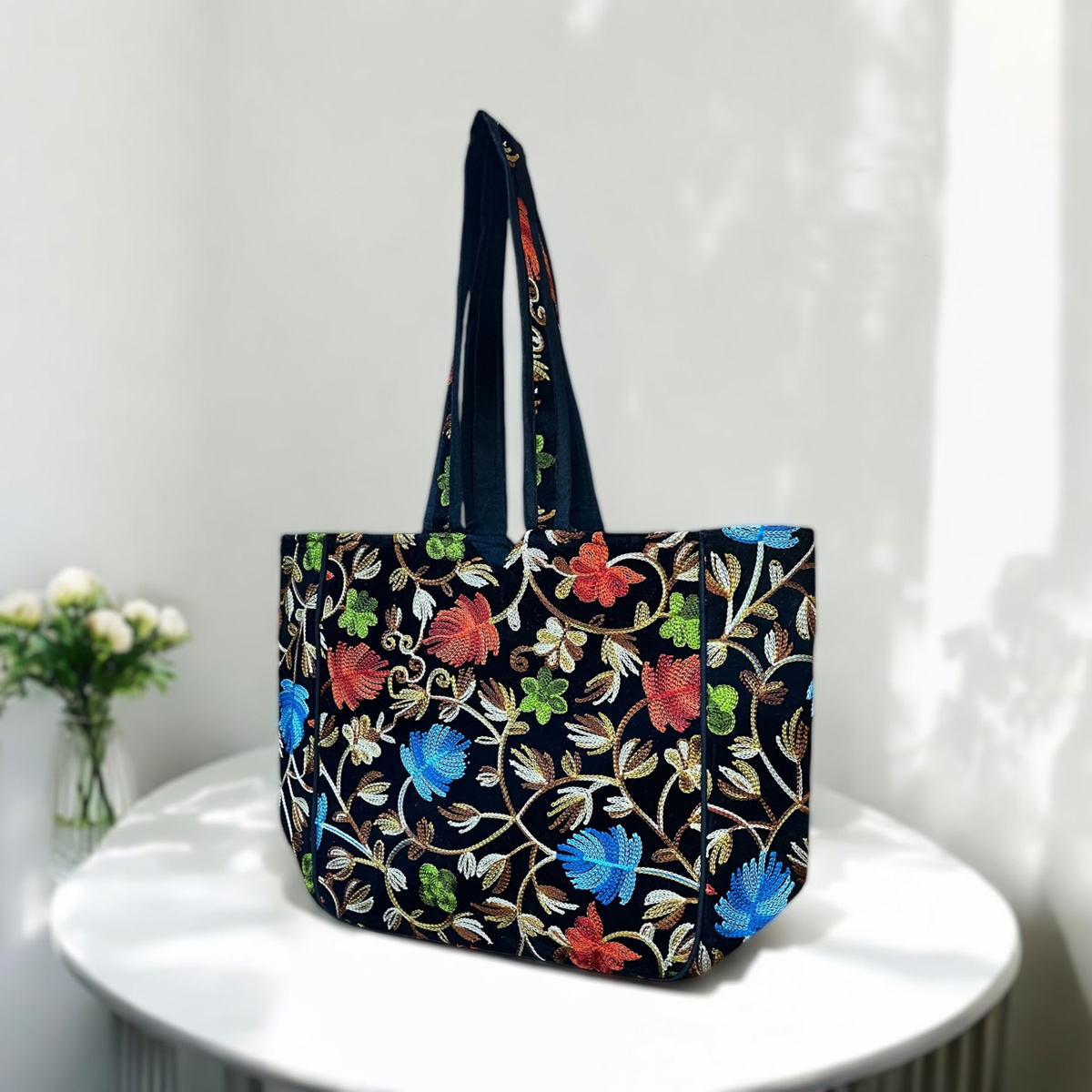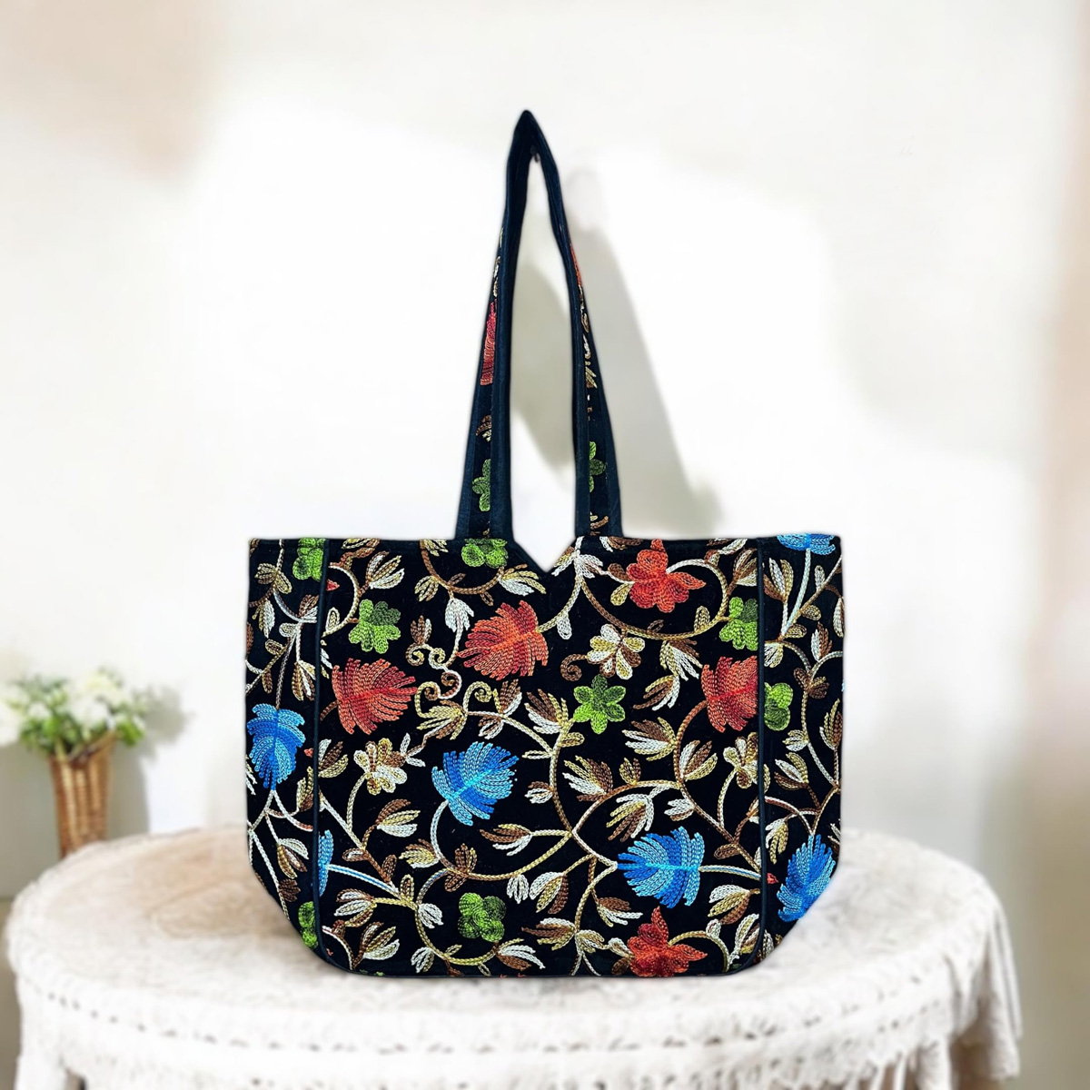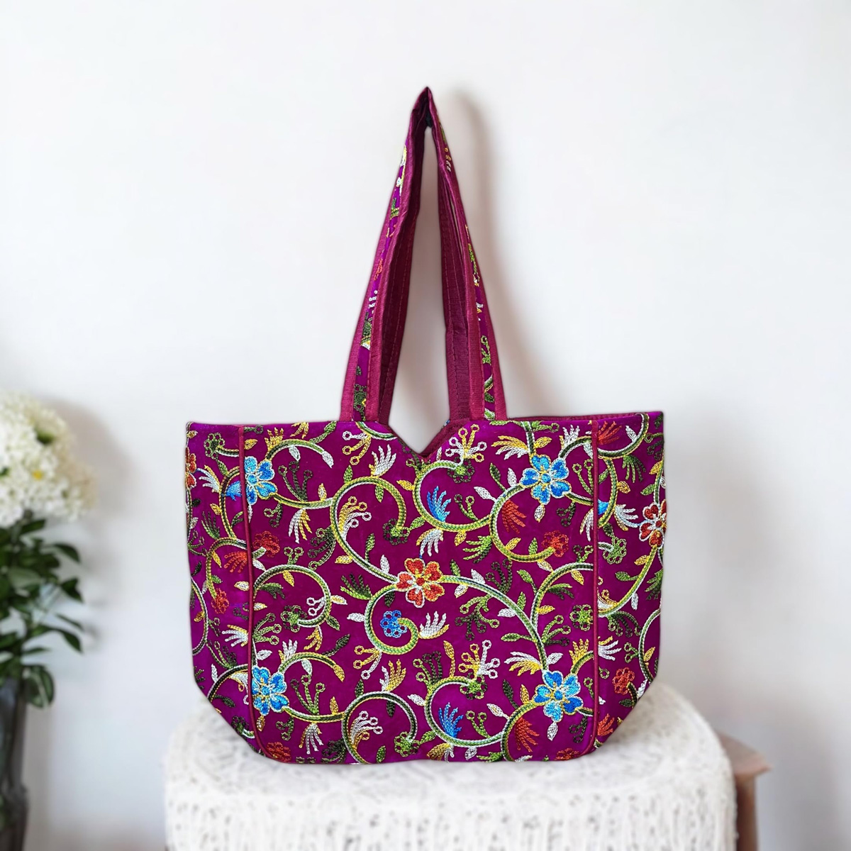 Kashmiri Flower Embroidered Tote Bag Indian Handicrafted Boho Bag