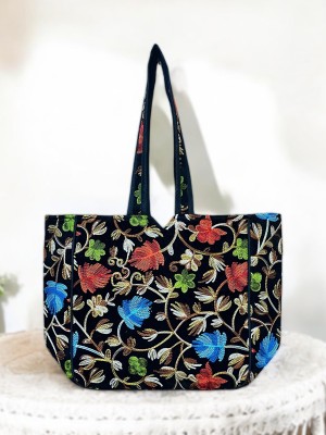 Black Kashmiri Flower Embroidered Tote Bag Indian Handicrafted Boho Bag