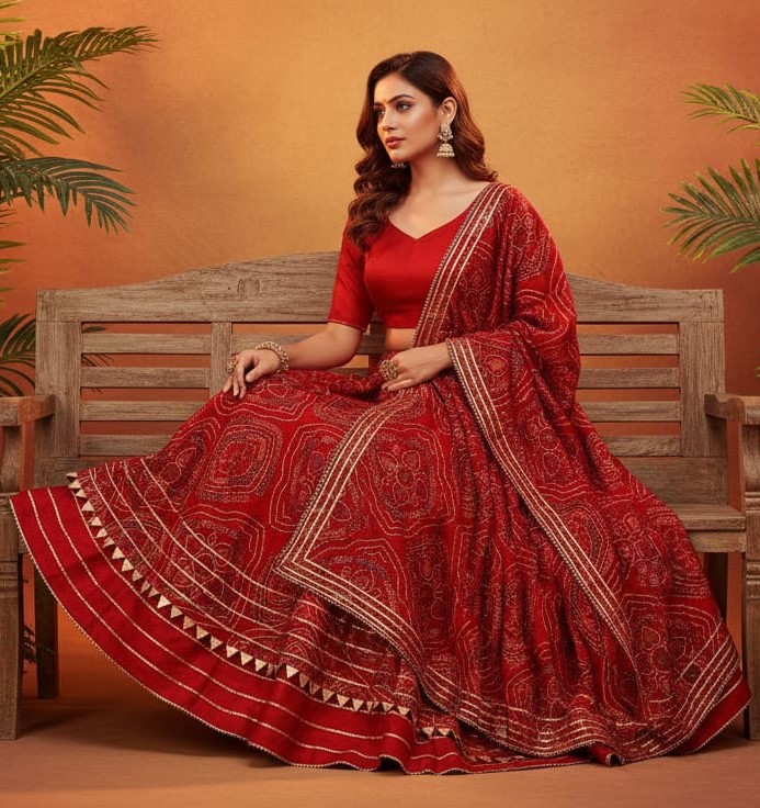 Red Multi Bandhni Print Lehenga Dupatta Set Ethnic Gujrati Embroidered Gota Patti Lehenga