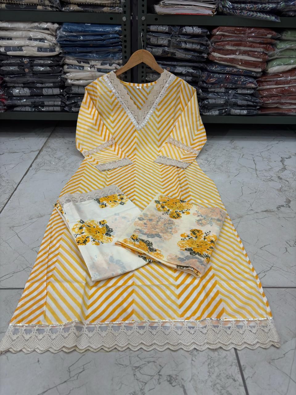 Elevate your ethnic wardrobe with this elegant Yellow Striped Printed V Neck Straight Salwar Kameez Set. Featuring stylish stripe prints and delicate crocia lace work, this set includes a straight kurti, matching pants, and a graceful dupatta. Perfect for daily wear, festive gatherings, or casual outings with a comfortable and classy look.