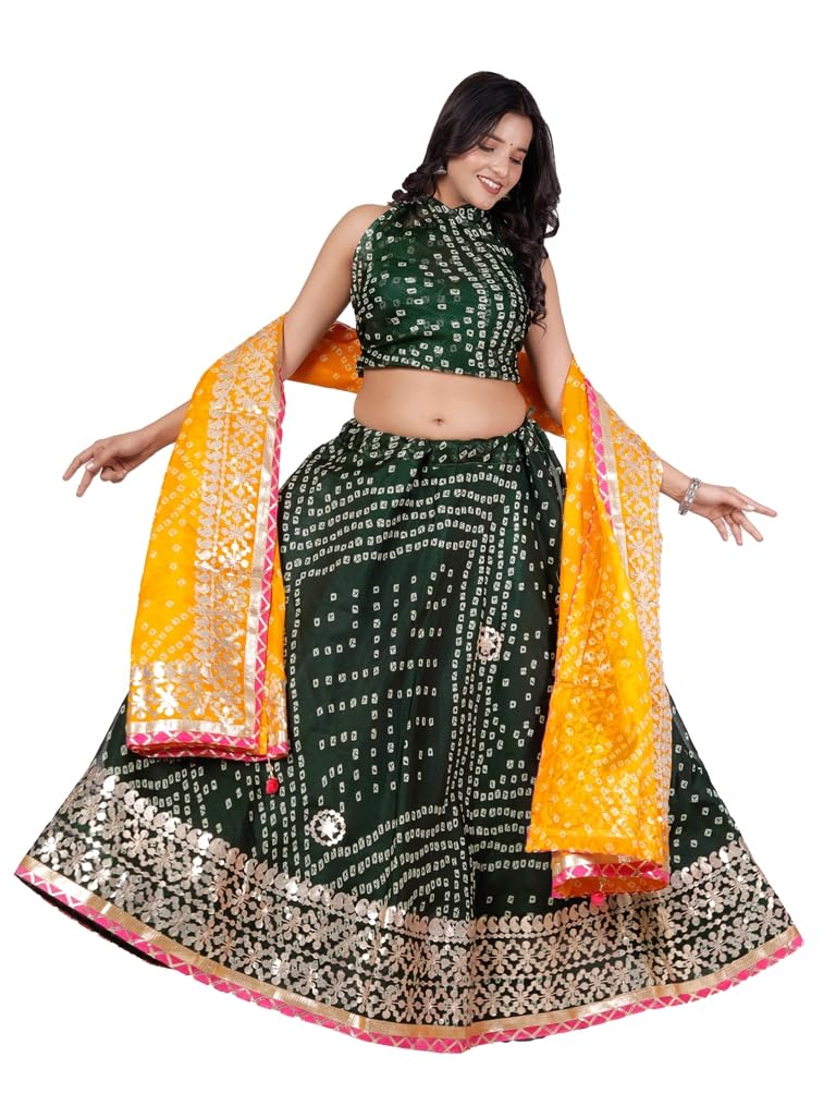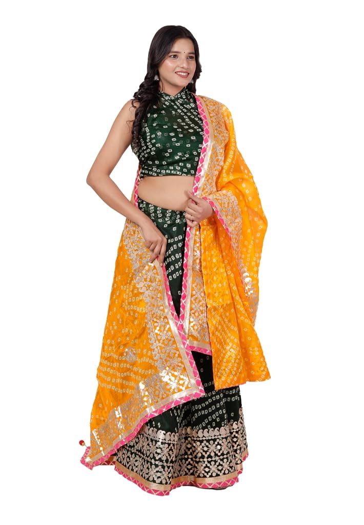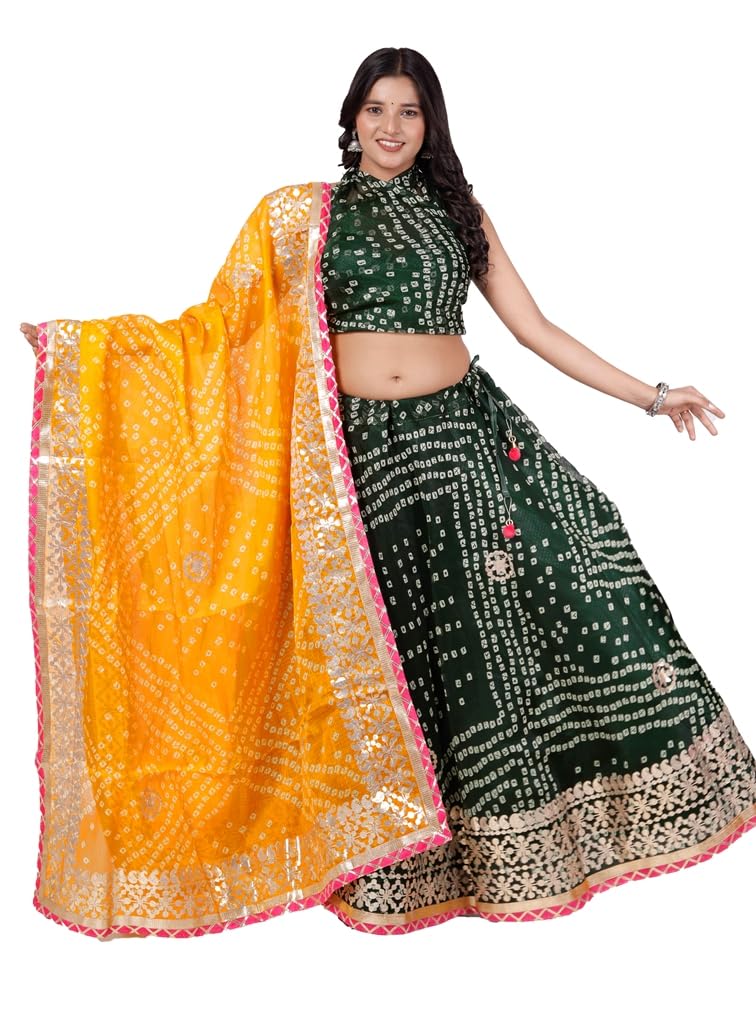 Green & Yellow Gujarati Bandhani Lehenga Readymade Gota Patti Lehenga Chunni Set