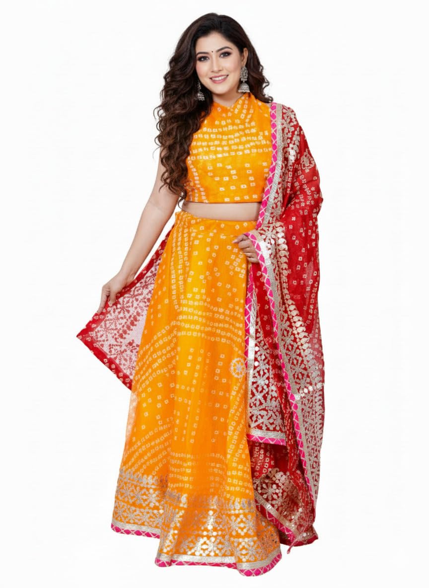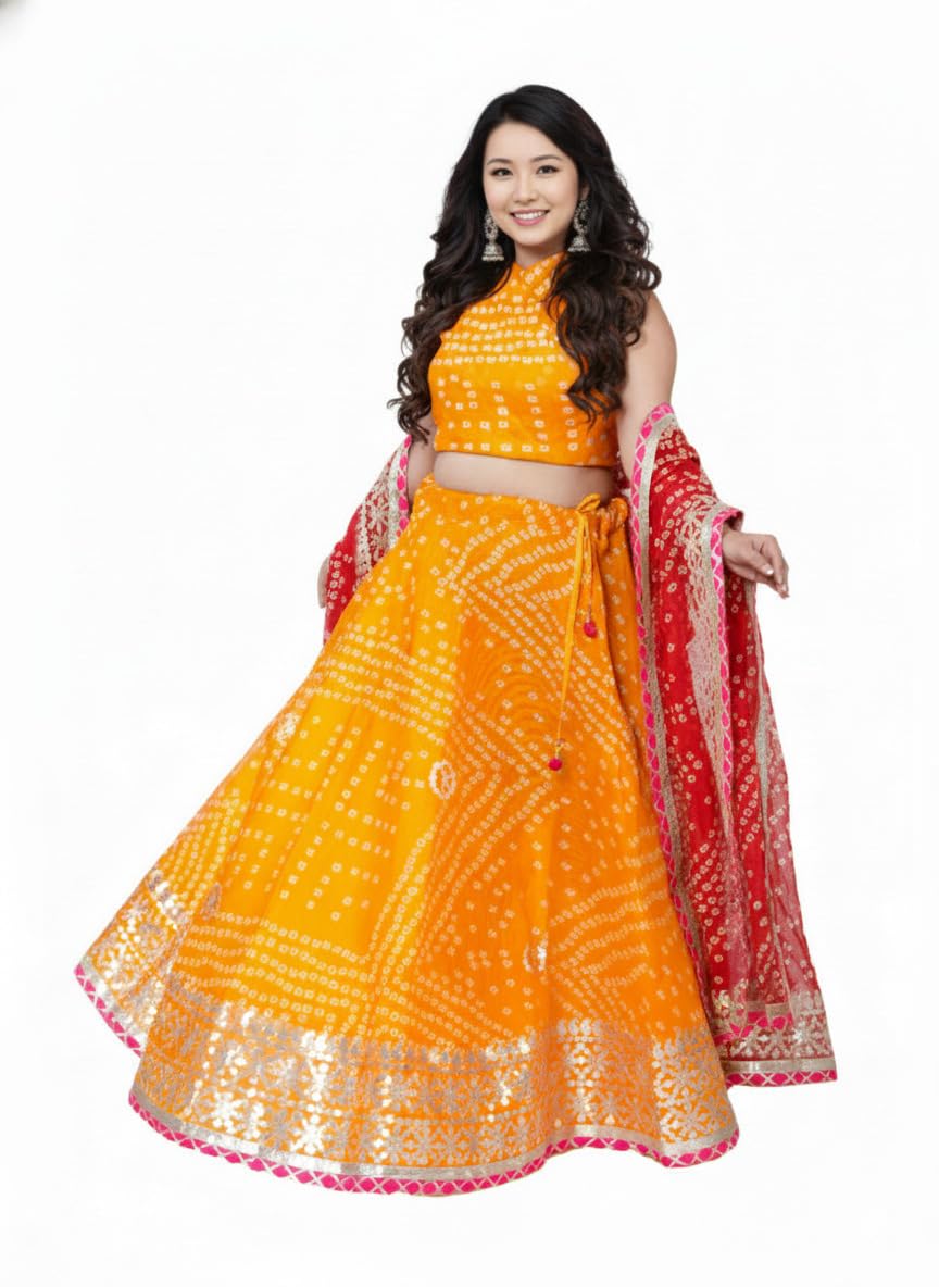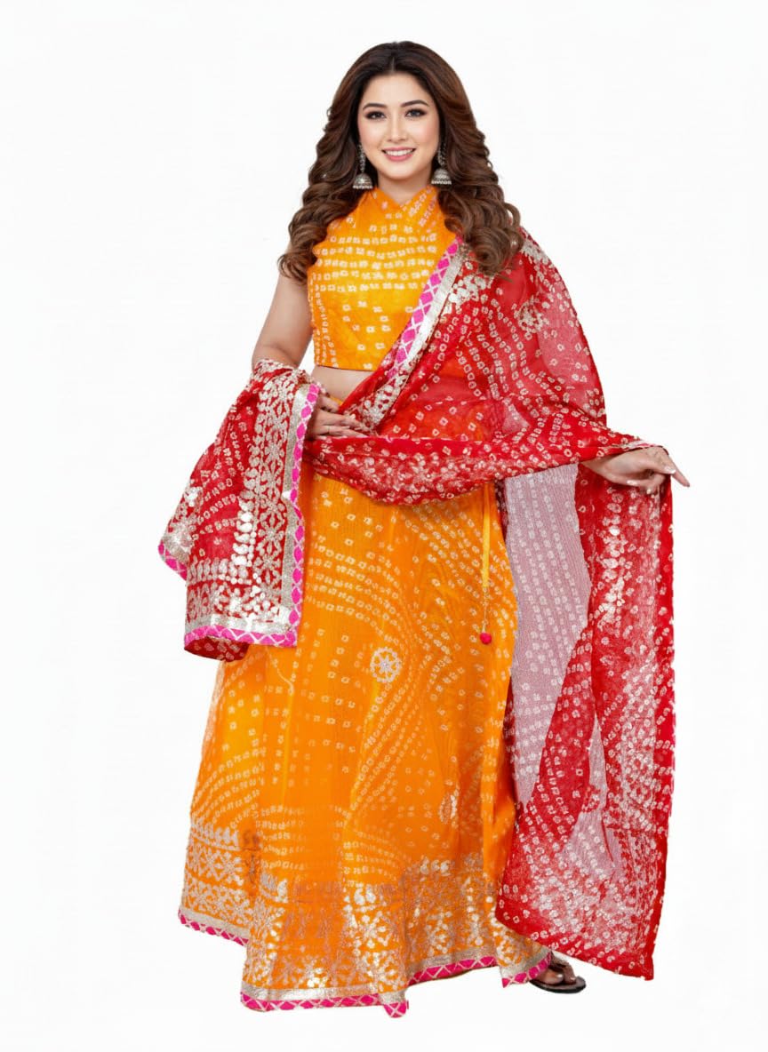 Yellow & Red Traditional Gota Patti Chaniya Choli Kota Doria Bandhani Lehenga Dupatta Set