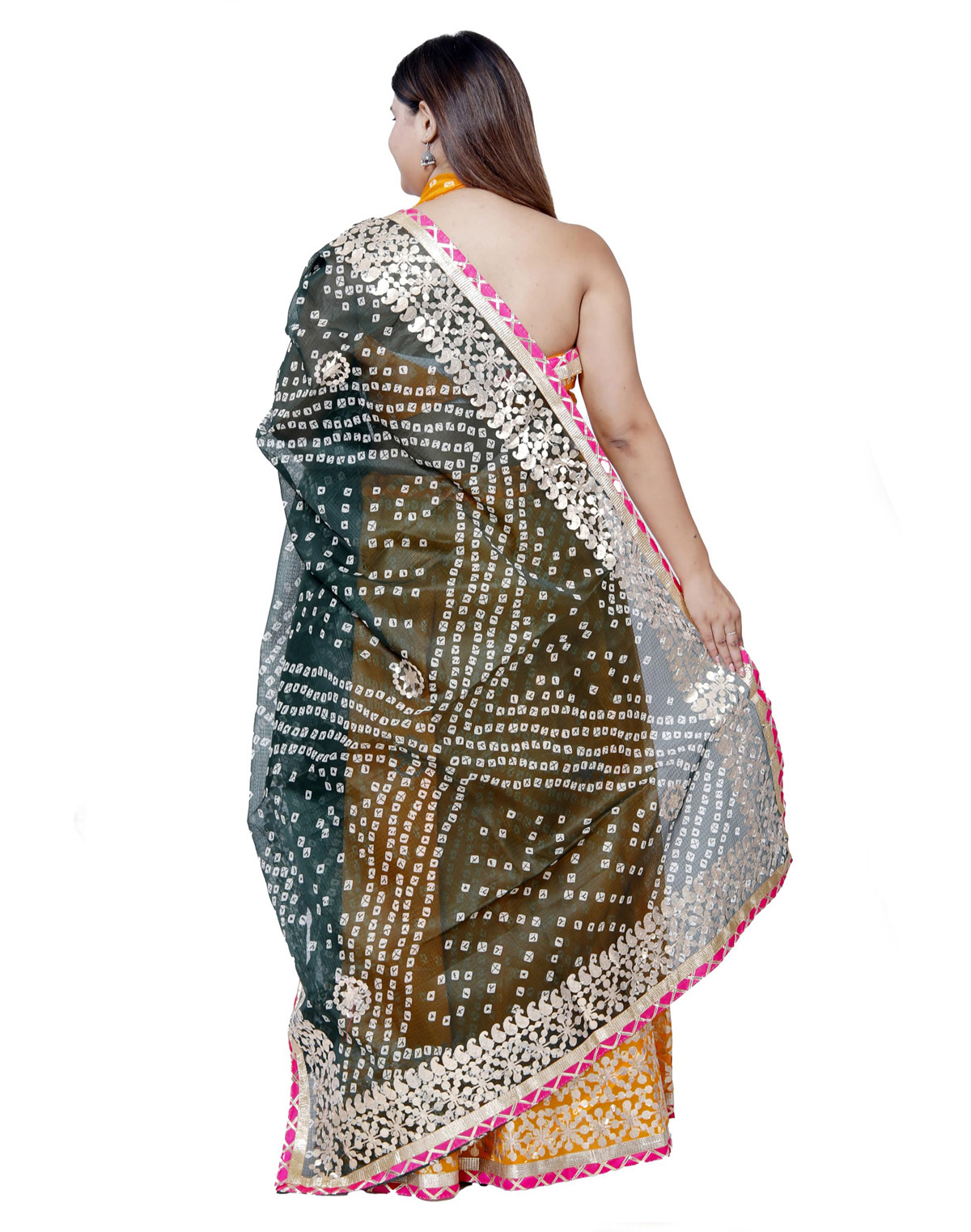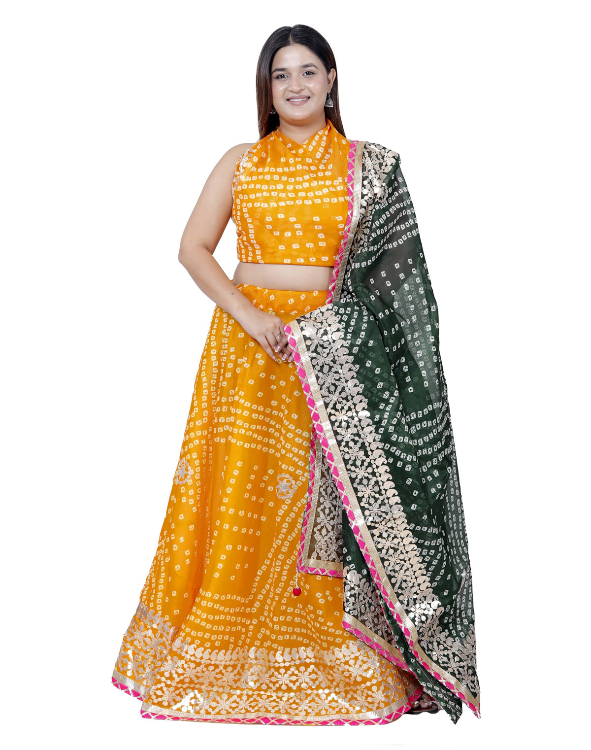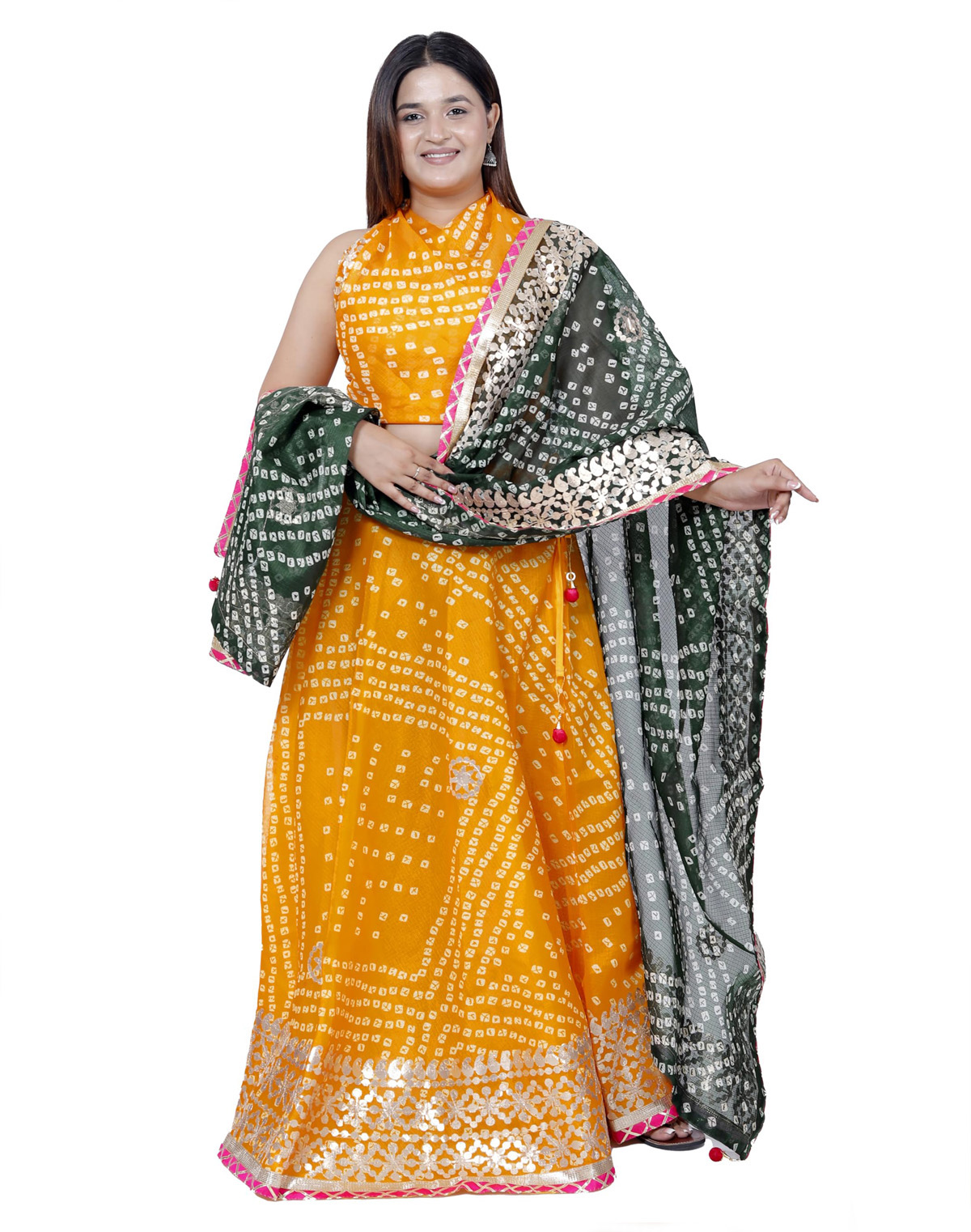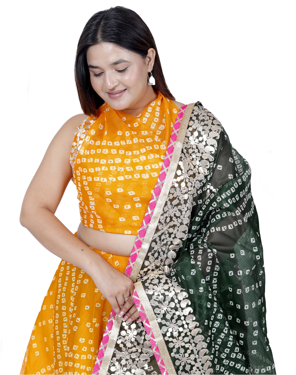 Exquisite traditional kota doria bandhani lehenga choli set with dupatta featuring intricate ethnic Jaipuri self-design gota patti lace border work and beautiful bandhej patterns in elegant colours. It's perfect for weddings, festivals, traditional ceremonies, and special cultural celebrations where ethnic attire is preferred.