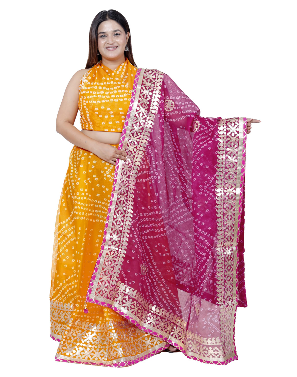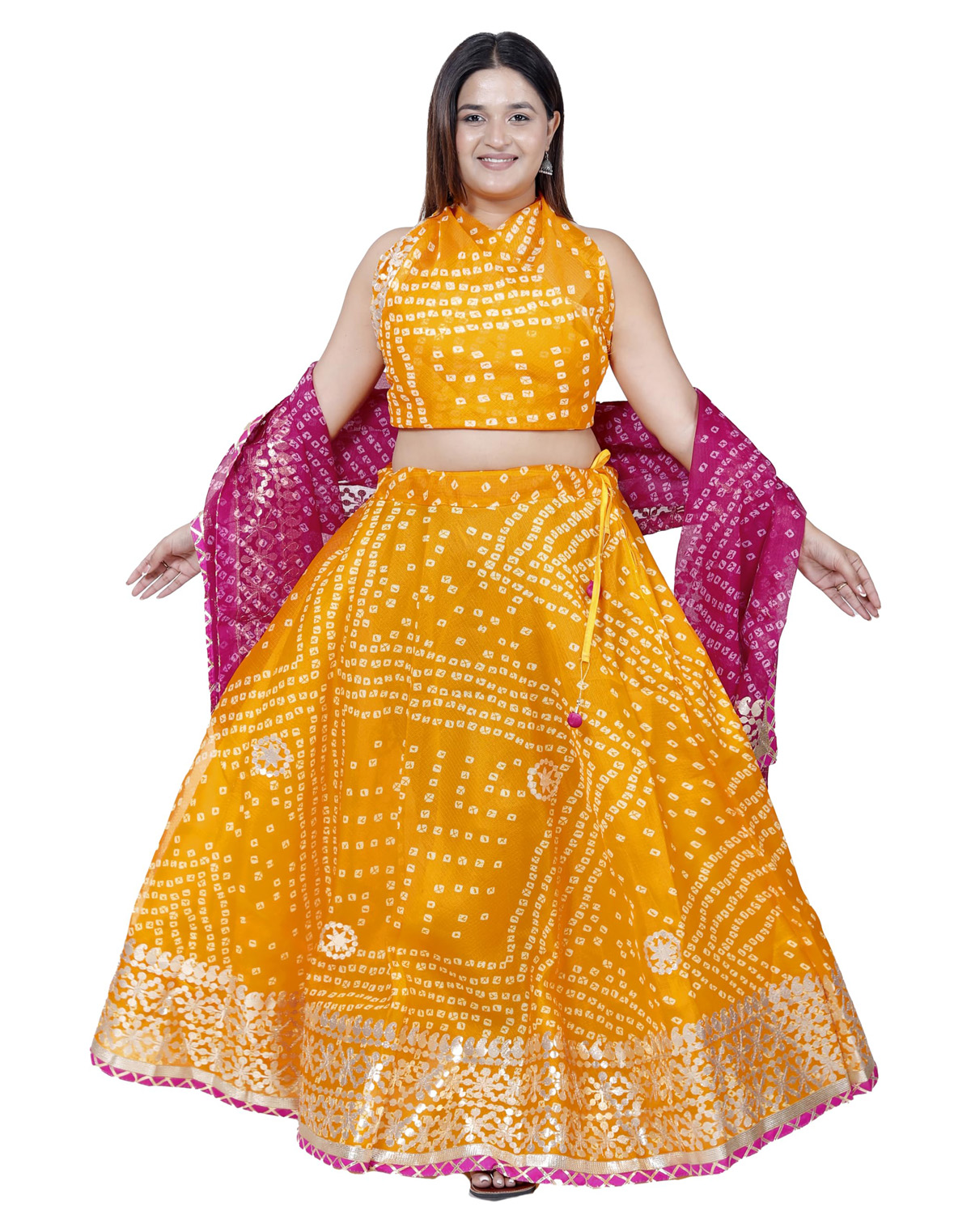 Yellow & Pink Ethnic Gota Patti Work Chaniya Choli Kota Doria Bandhej Lehenga Dupatta Set
