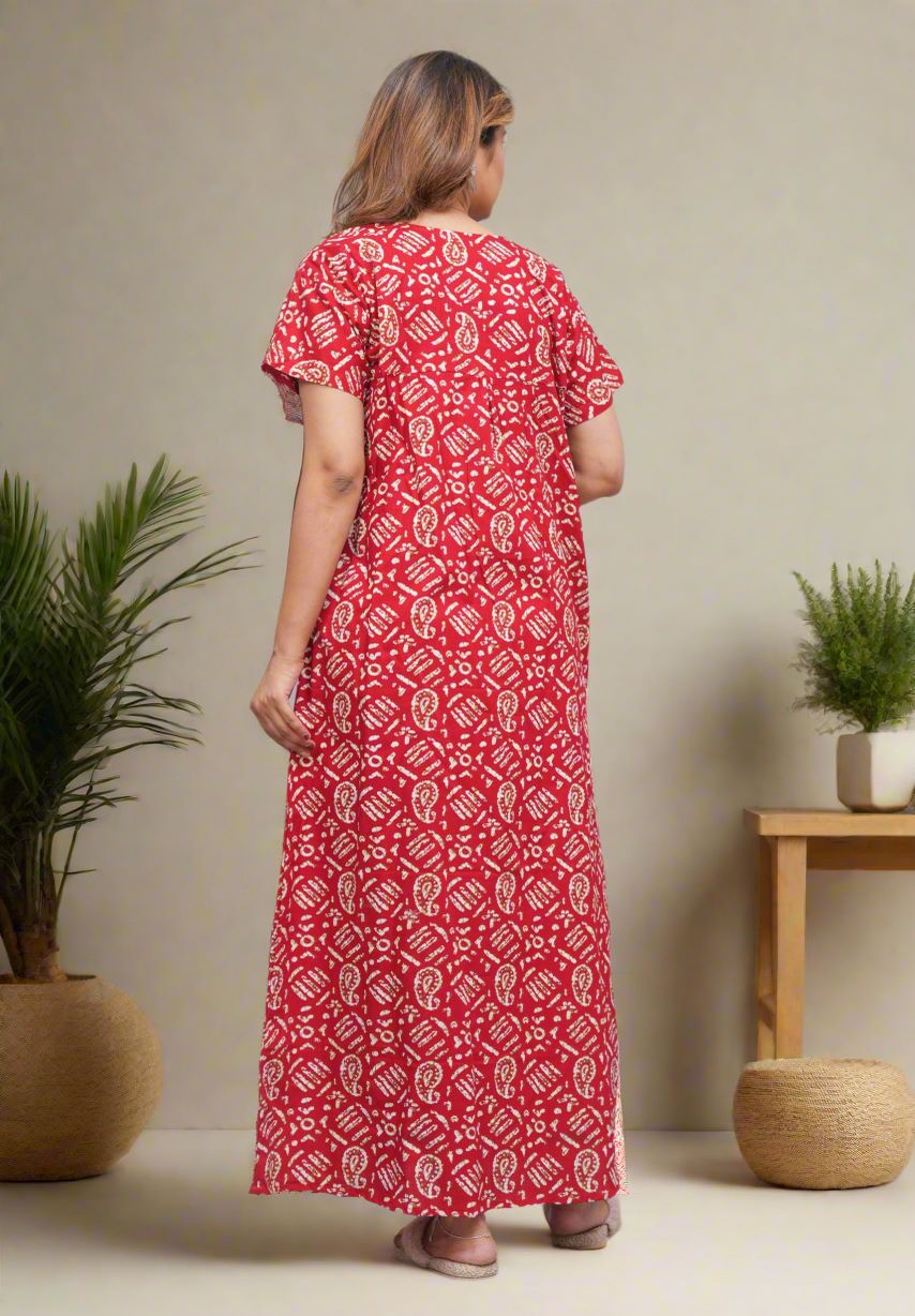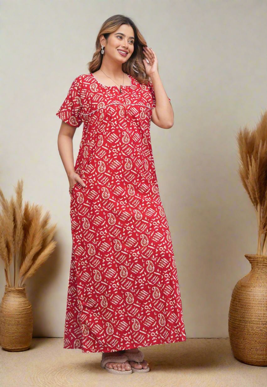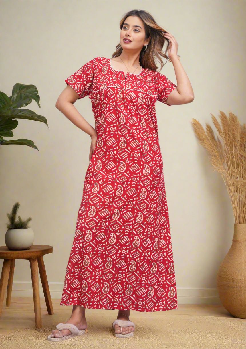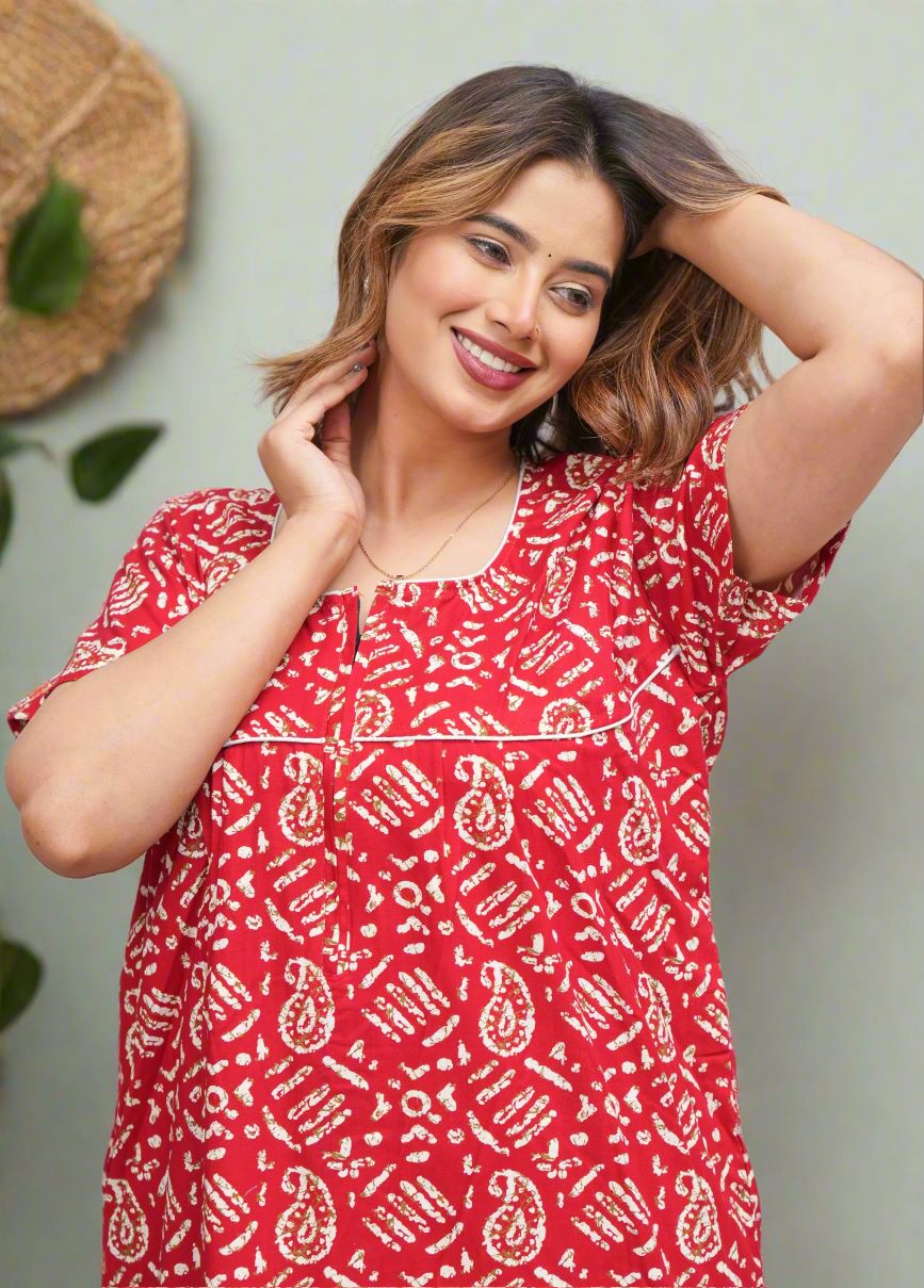 Red Front Long Zipper Cotton Nighty Night Gown Indoor Wear Comfortable Paisley Printed Night Kurti with Mobile Pocket