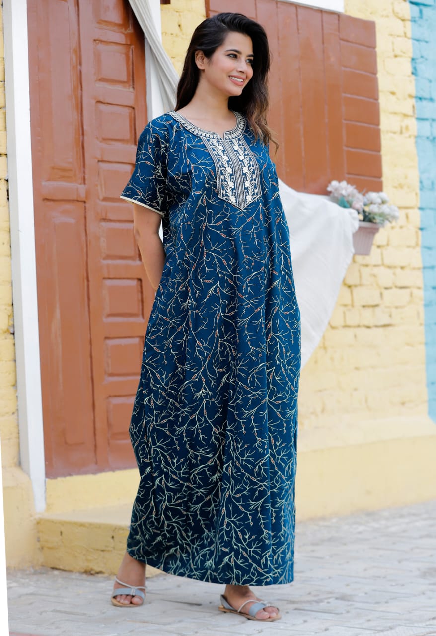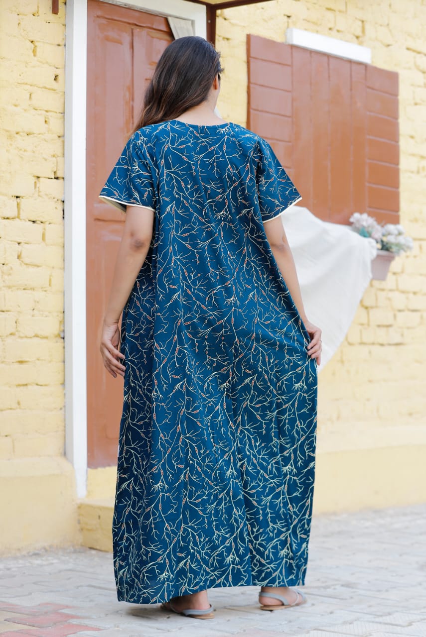 • Navy Blue Cotton Nighty Night Gown Indoor Wear Comfortable Printed Night Maxi Kurti