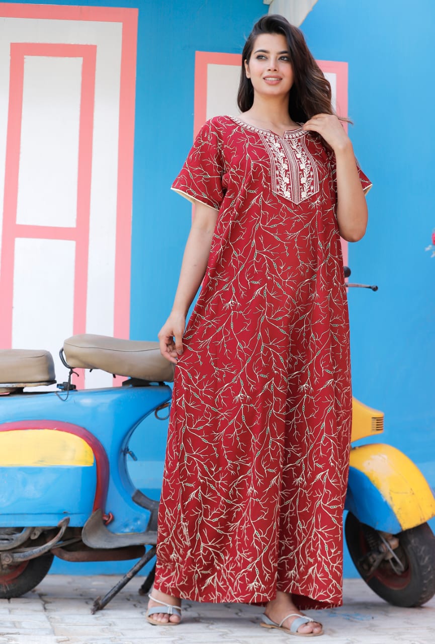 Red Cotton Nighty Night Gown Indoor Wear Comfortable Printed Night Kurti Maxi