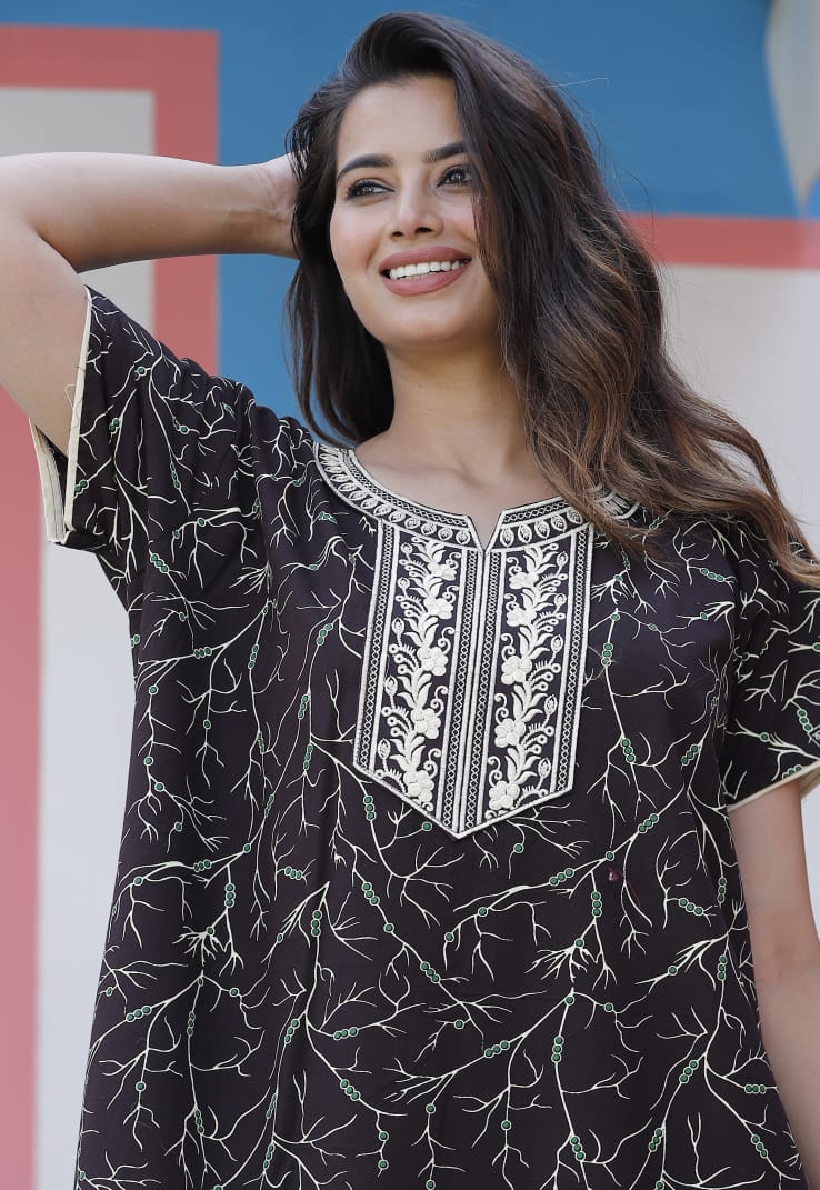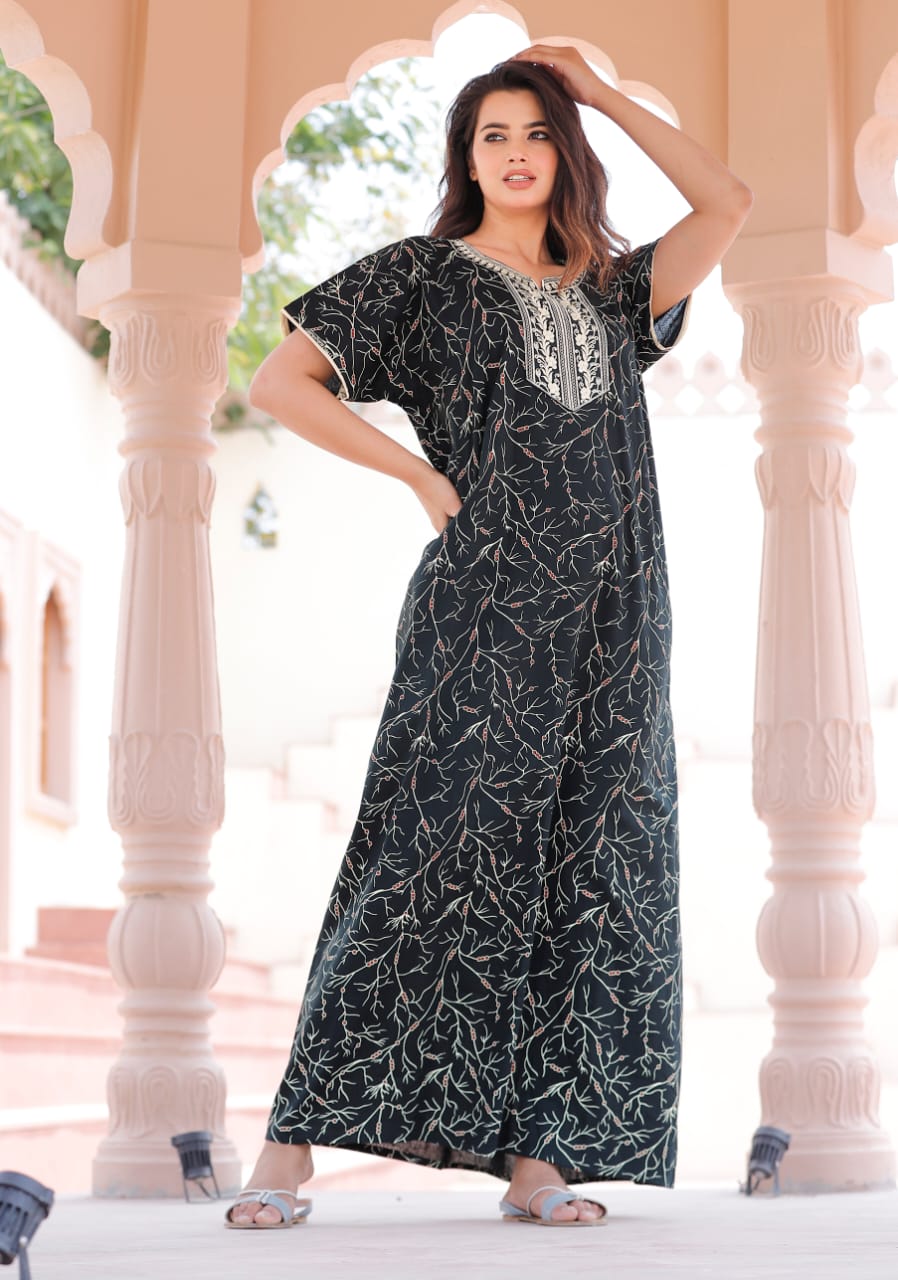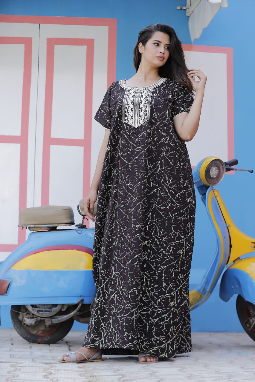 Black Cotton Nighty Night Gown Indoor Wear Comfortable Printed Night Maxi Kurti