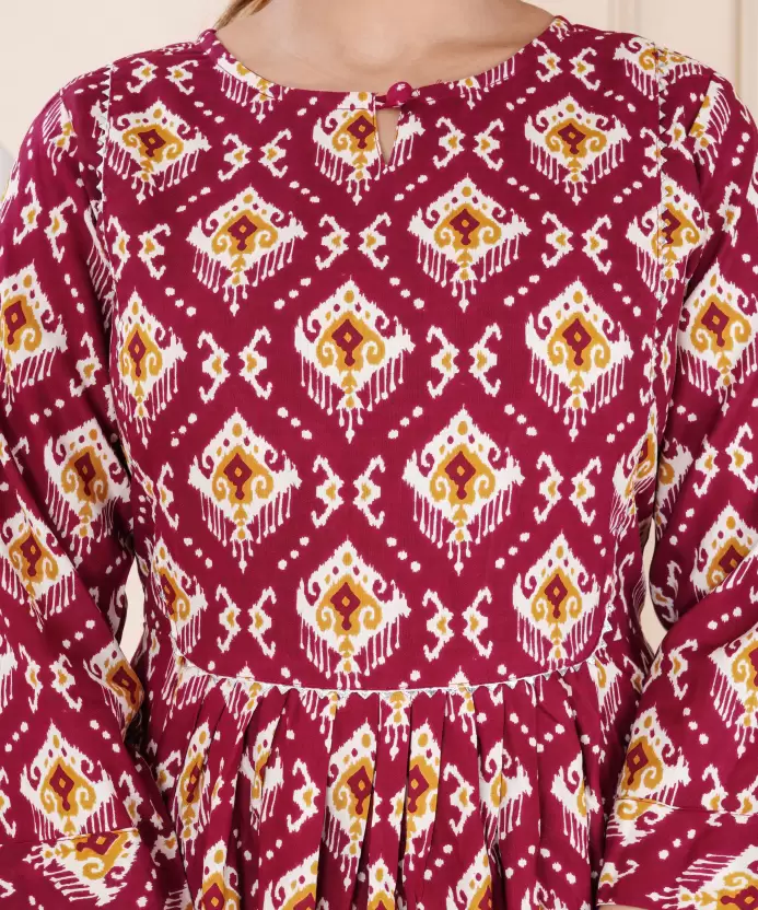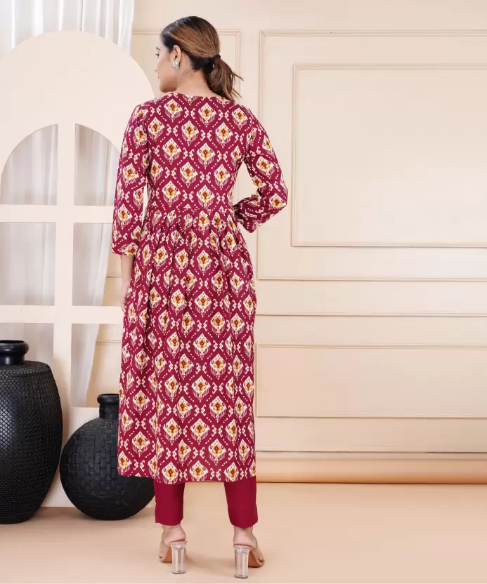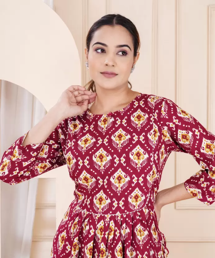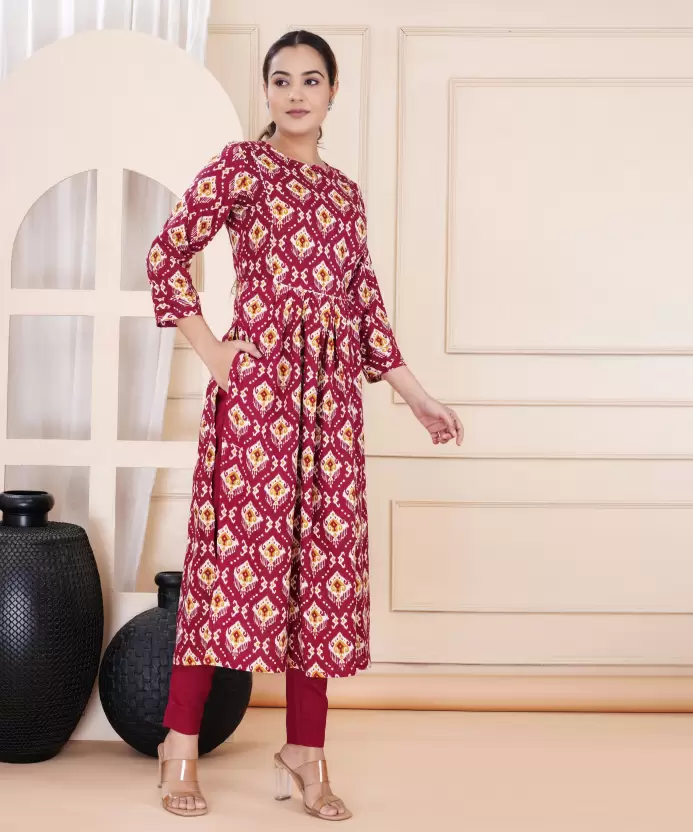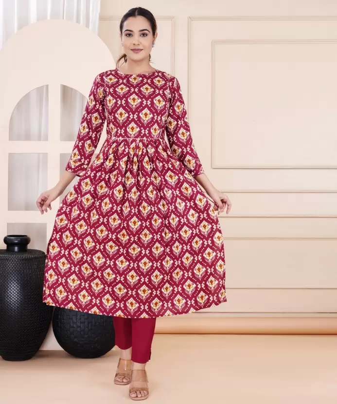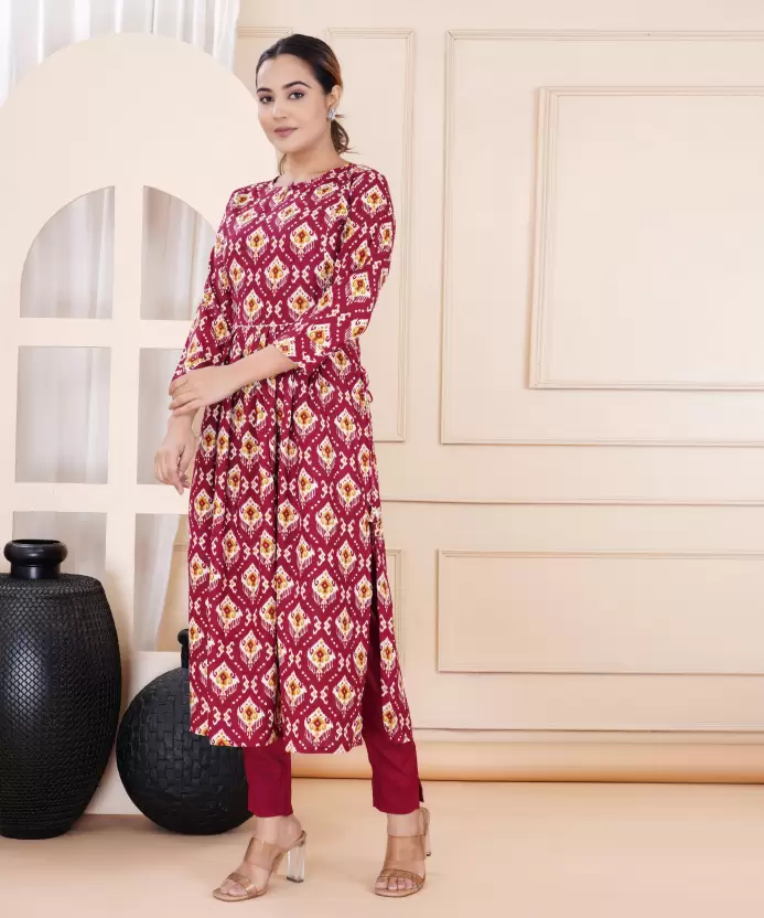 Maroon Printed Nayra Cut Kurta Saalwar Kameez Suit Rayon Kurti Pant Set