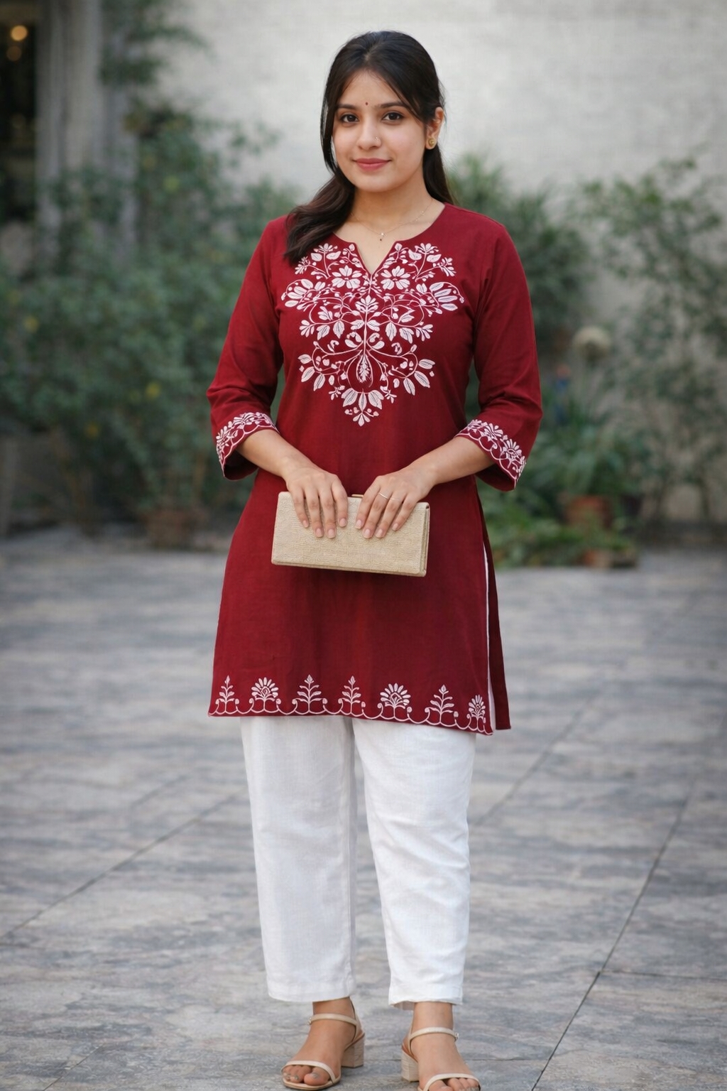 Ishrat Red Embroidered Cotton Short Kurti Palazzo Co Ord Set for Women - Set of 2