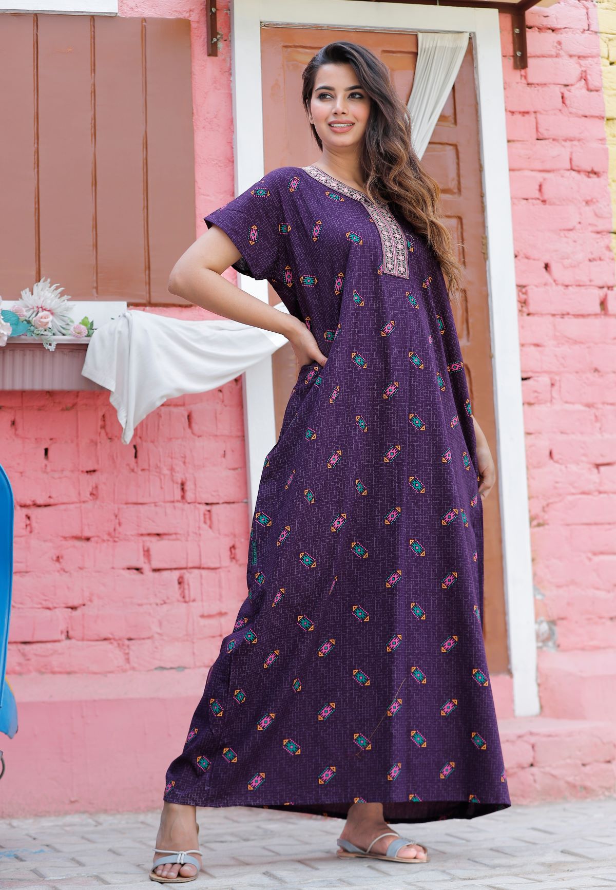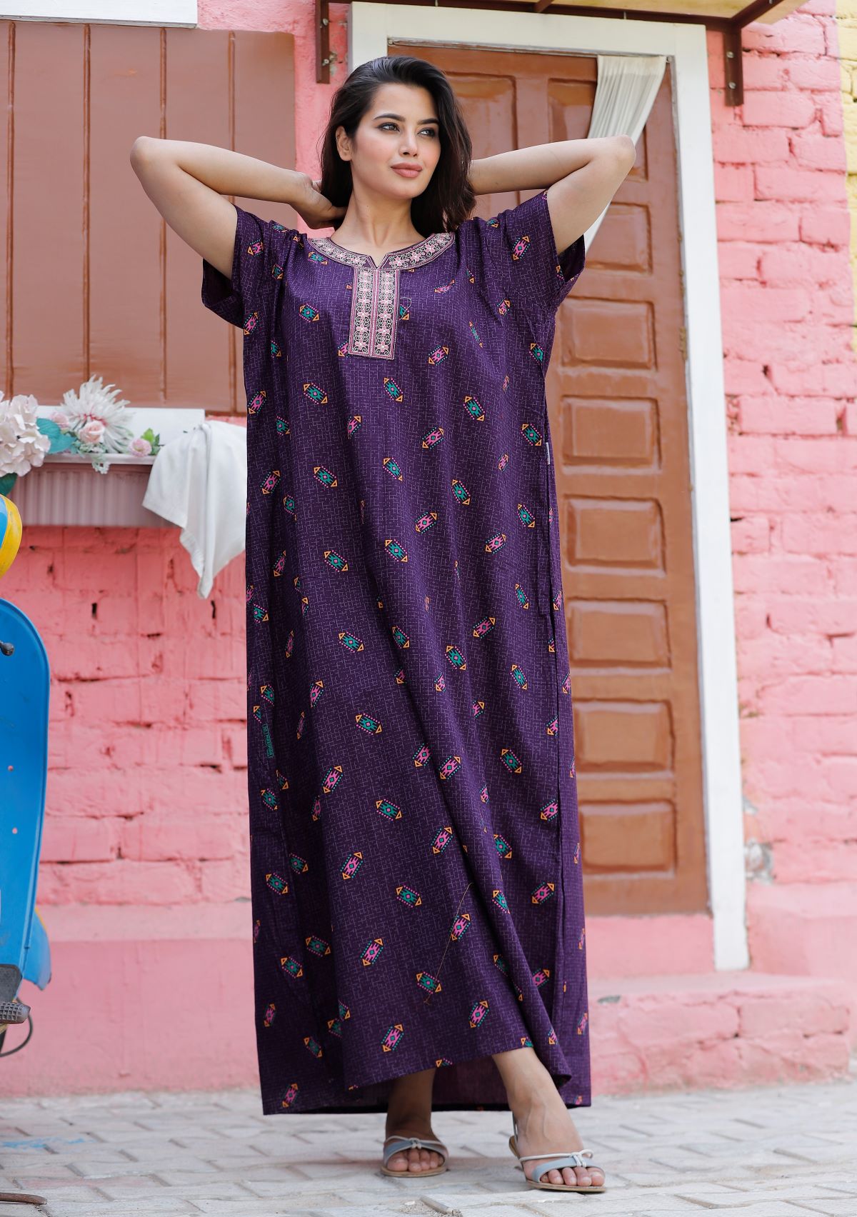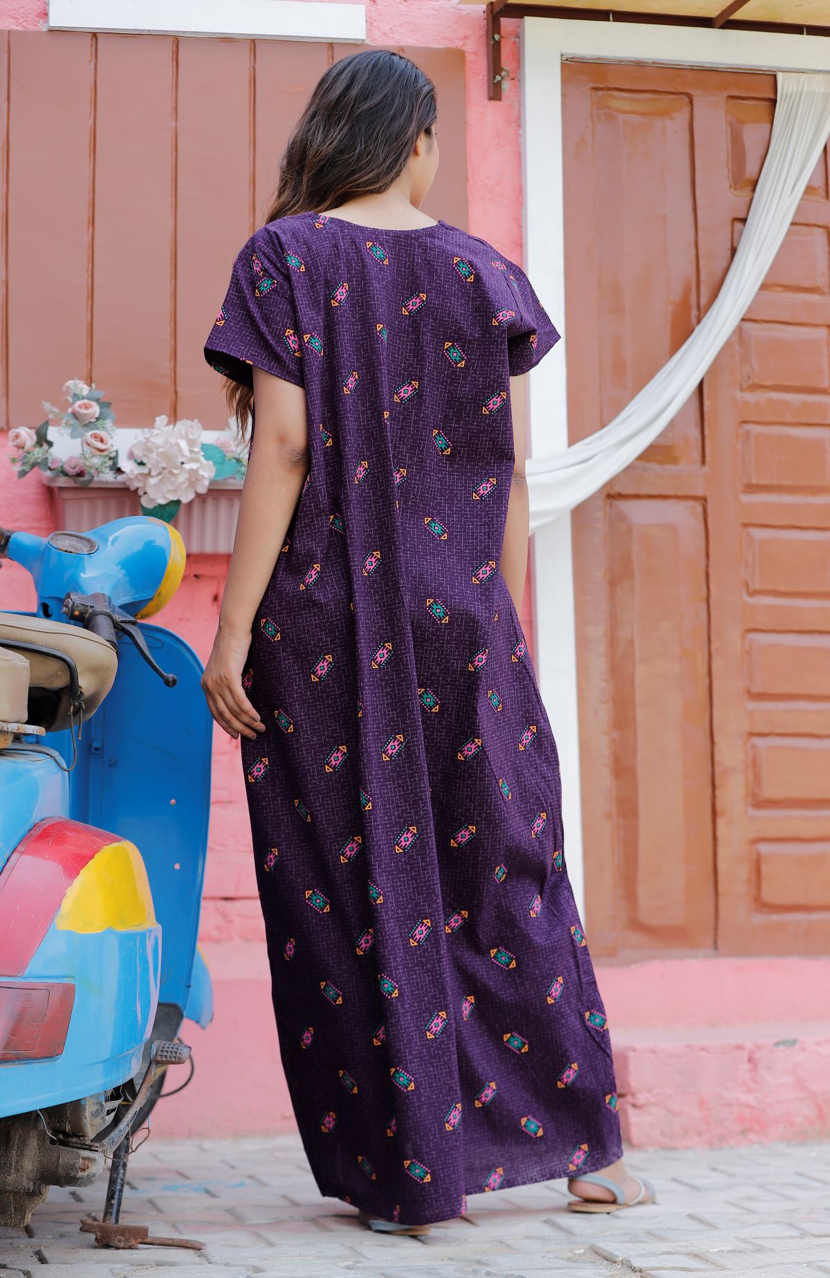 Wine Cotton Nighty Night Gown Indoor Wear Comfortable Printed Night Kurti Maxi
