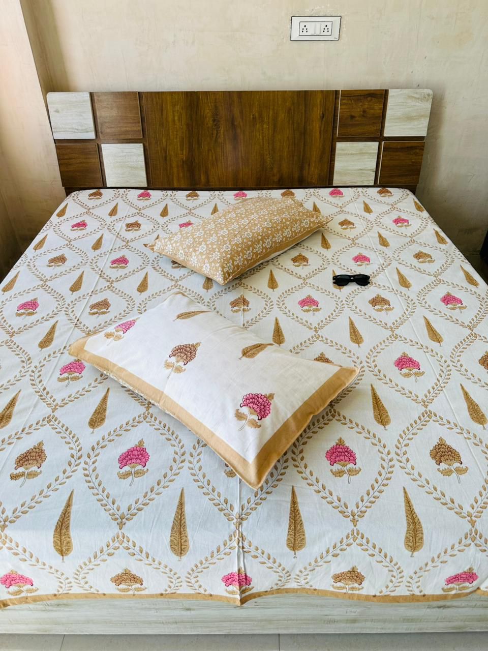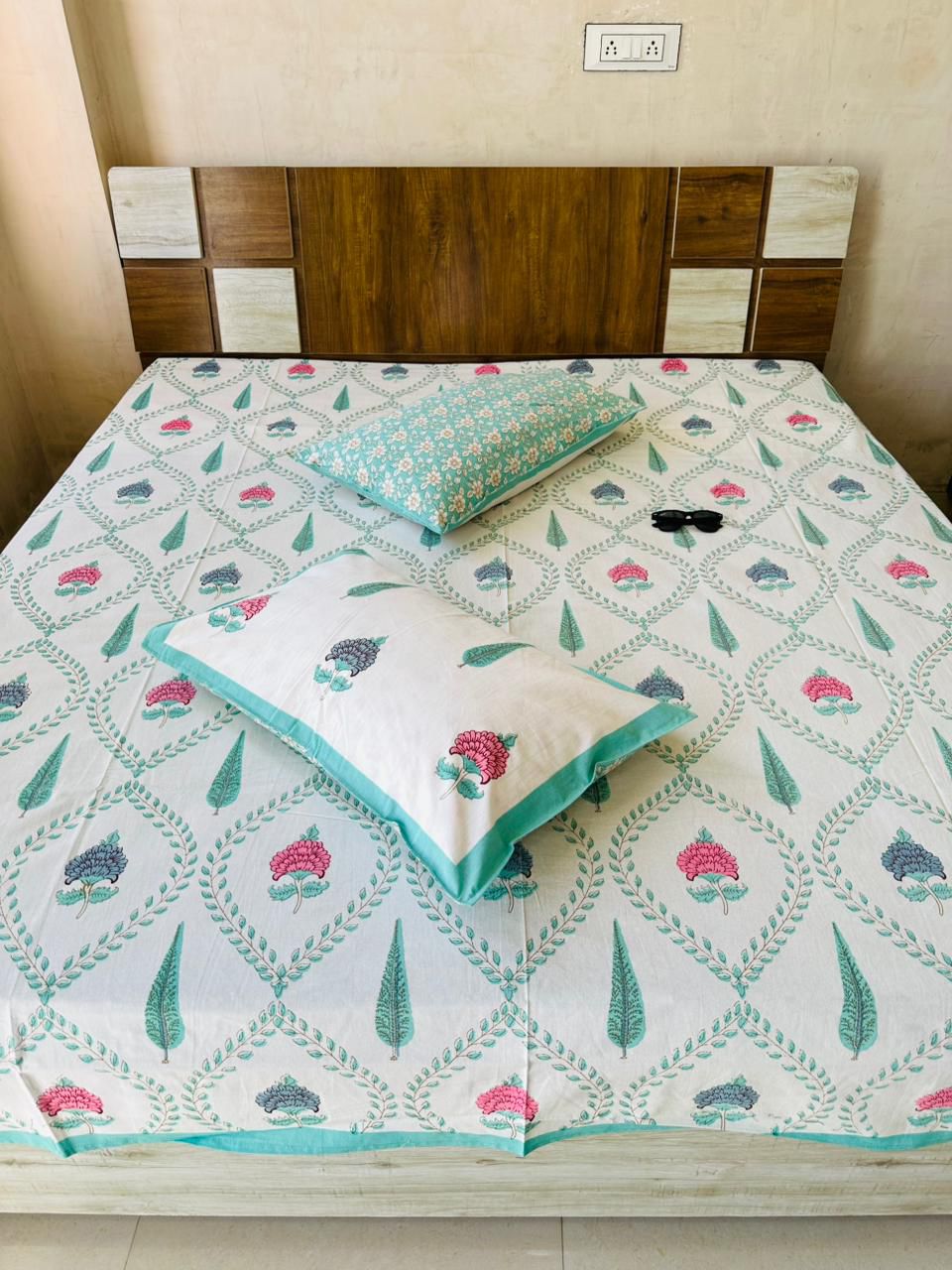Ghoomer Floral Block Printed Cotton Jaipuri King Size Bed Sheet with 2 Pillow Sham