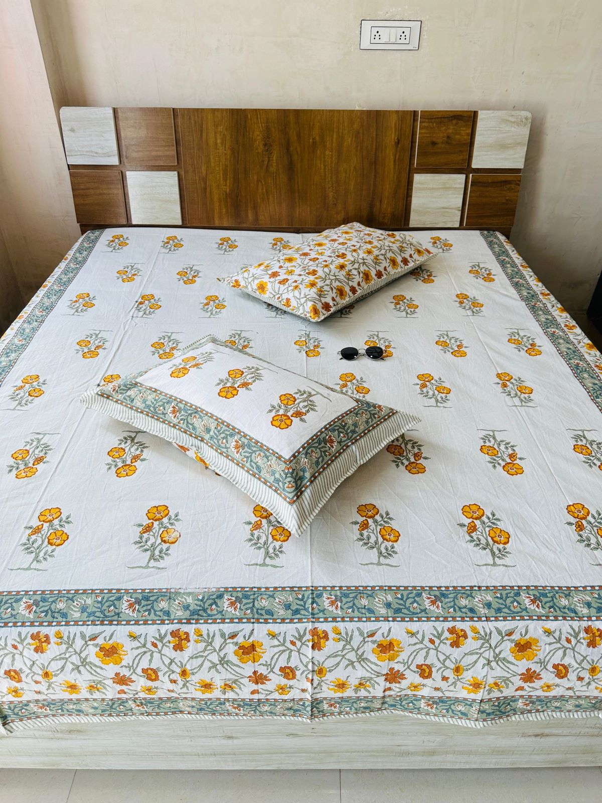 Transform your bedroom with this designer hand block printed Jaipuri bedsheet for a king size bed. Crafted from premium-quality, 100% cotton, this bed sheet ensures breath ability and long-lasting comfort. This bed sheet set offers the perfect combination of luxury, comfort, and practicality, making it an excellent addition to any modern bedroom.