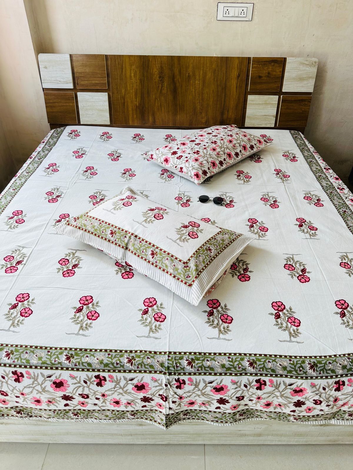 Floral White Multi Sanganeri Printed Cotton King Size Bed Sheet with Set of Pillow Covers