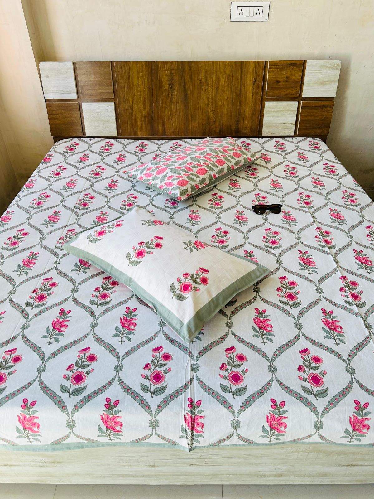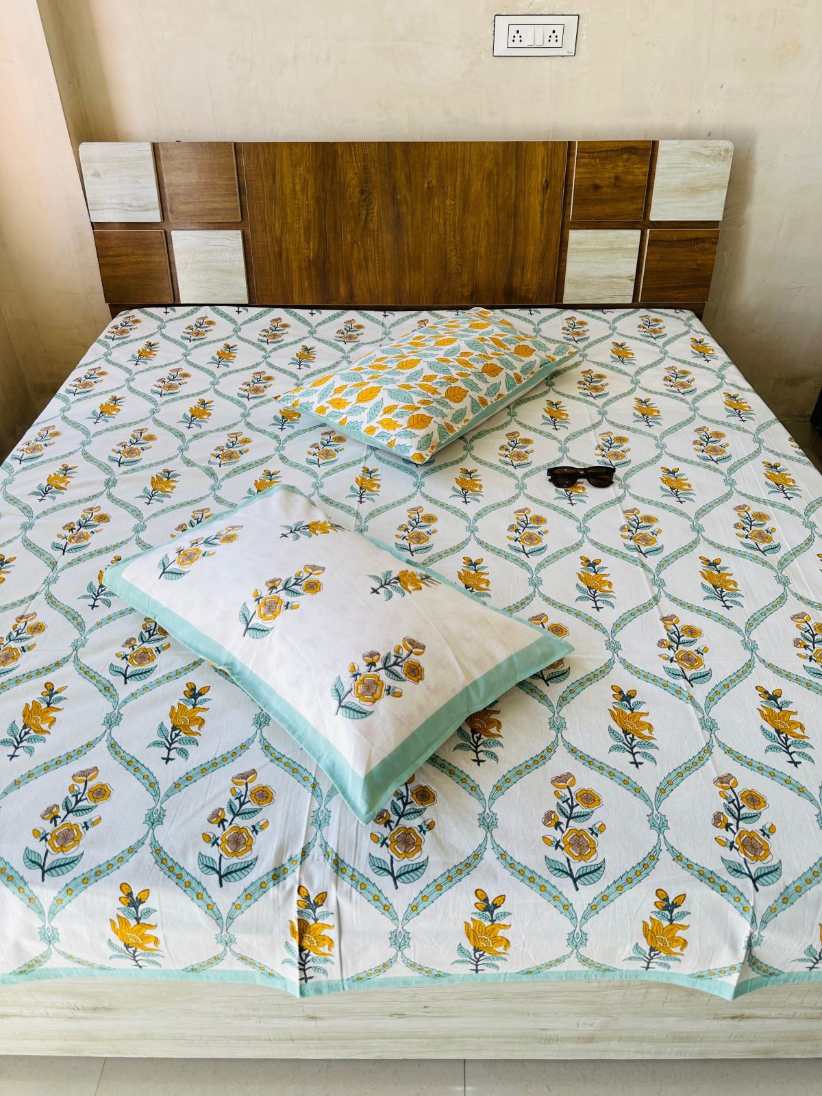 Multicolored Hand Block Printed Cotton King Size Bed Sheet with Set of Pillow Sham