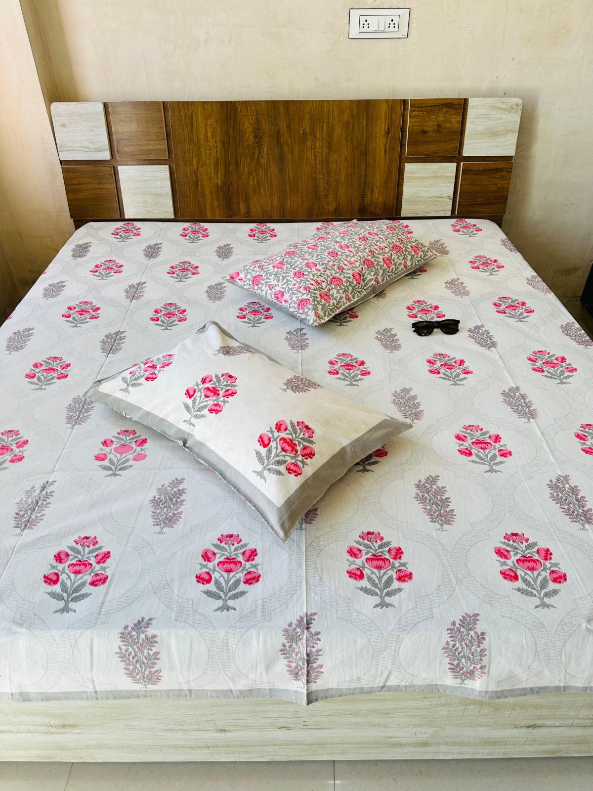 Unique Pastel Shade Floral Buti Block Printed Cotton King Size Indian Bed Sheet