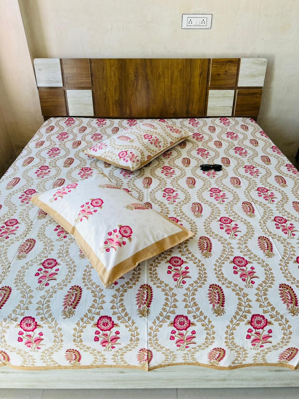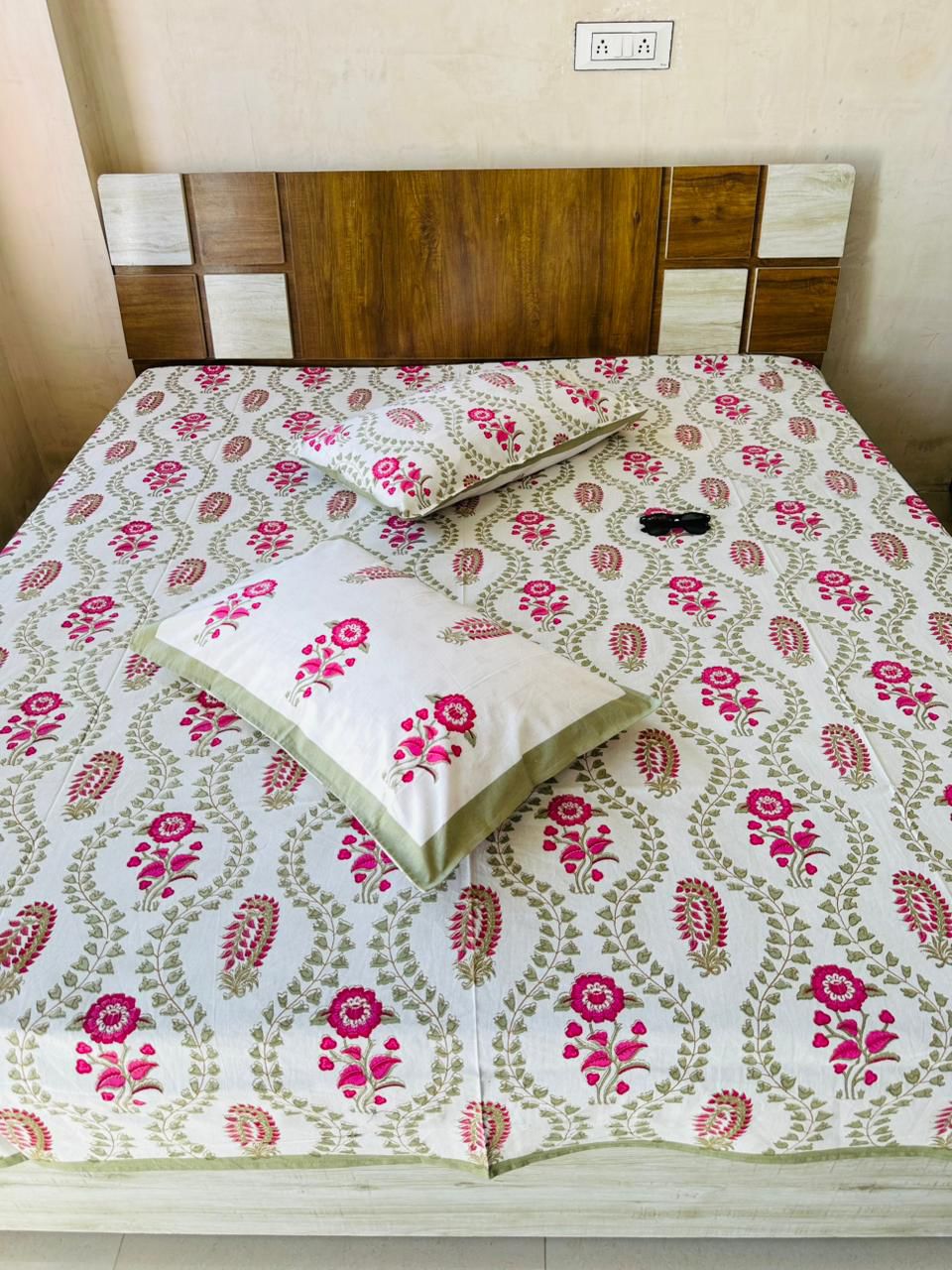 Premium Flower Buta Hand Block Printed Cotton Bedsheet with Matching Pillow Covers