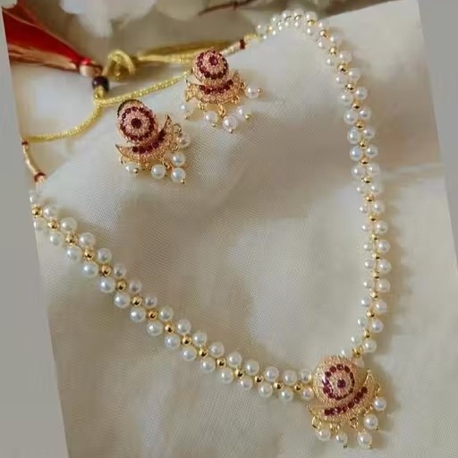 This product is a traditional pearl and Kundan necklace set featuring white pearls, golden beads, and a central pendant adorned with pink AD stones and matching earrings.
