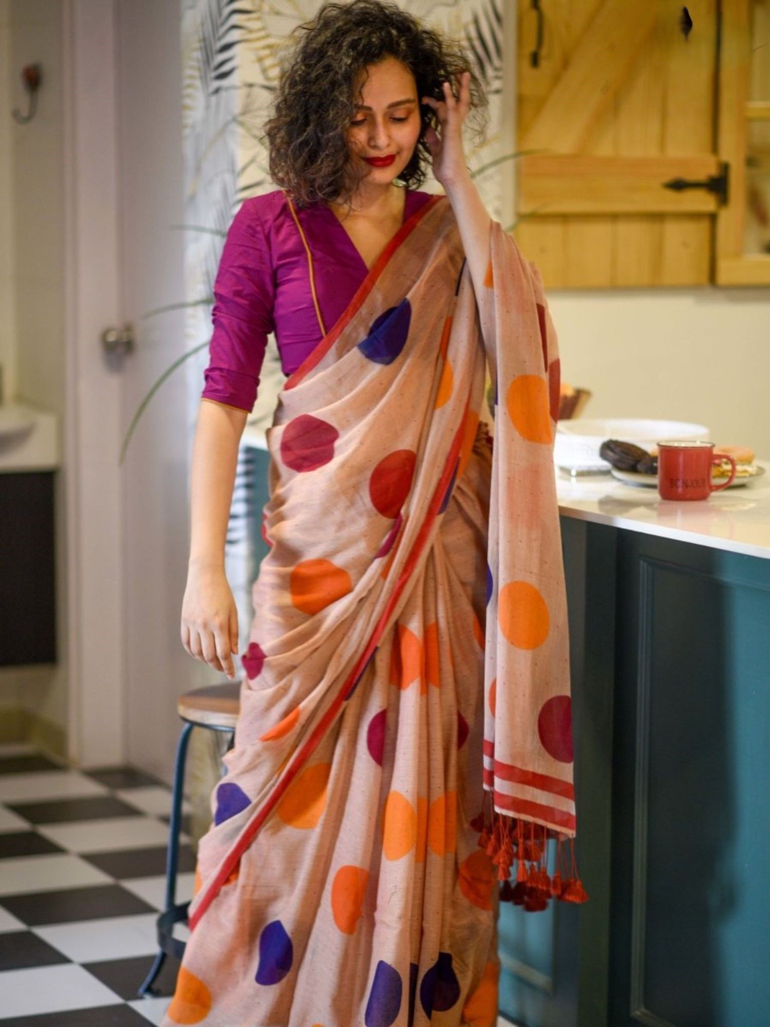 Multicolored Polka Print Pure Cotton Mulmul Saree with Blouse Piece