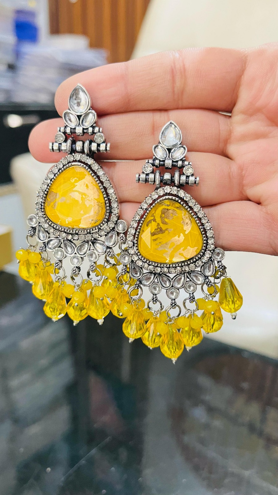 Yellow Exquisite Kundan Polki Chandbali Earrings with Pearl & Hydro Dangle Drops for Women
