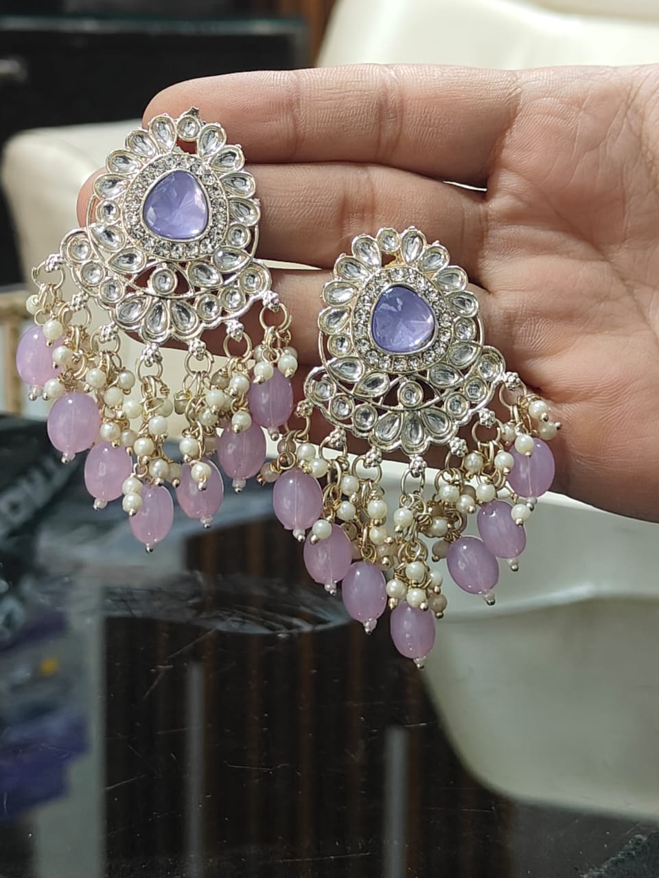 Lavender Indian Kundan Chandbali Earrings with Pearl Dangler Drops Traditional Polki Earring for Women