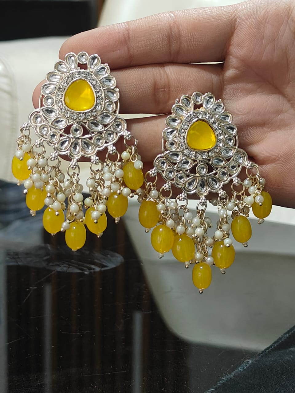 Yellow Indian Kundan Chandbali Earrings with Pearl Dangler Drops Traditional Polki Earring for Women