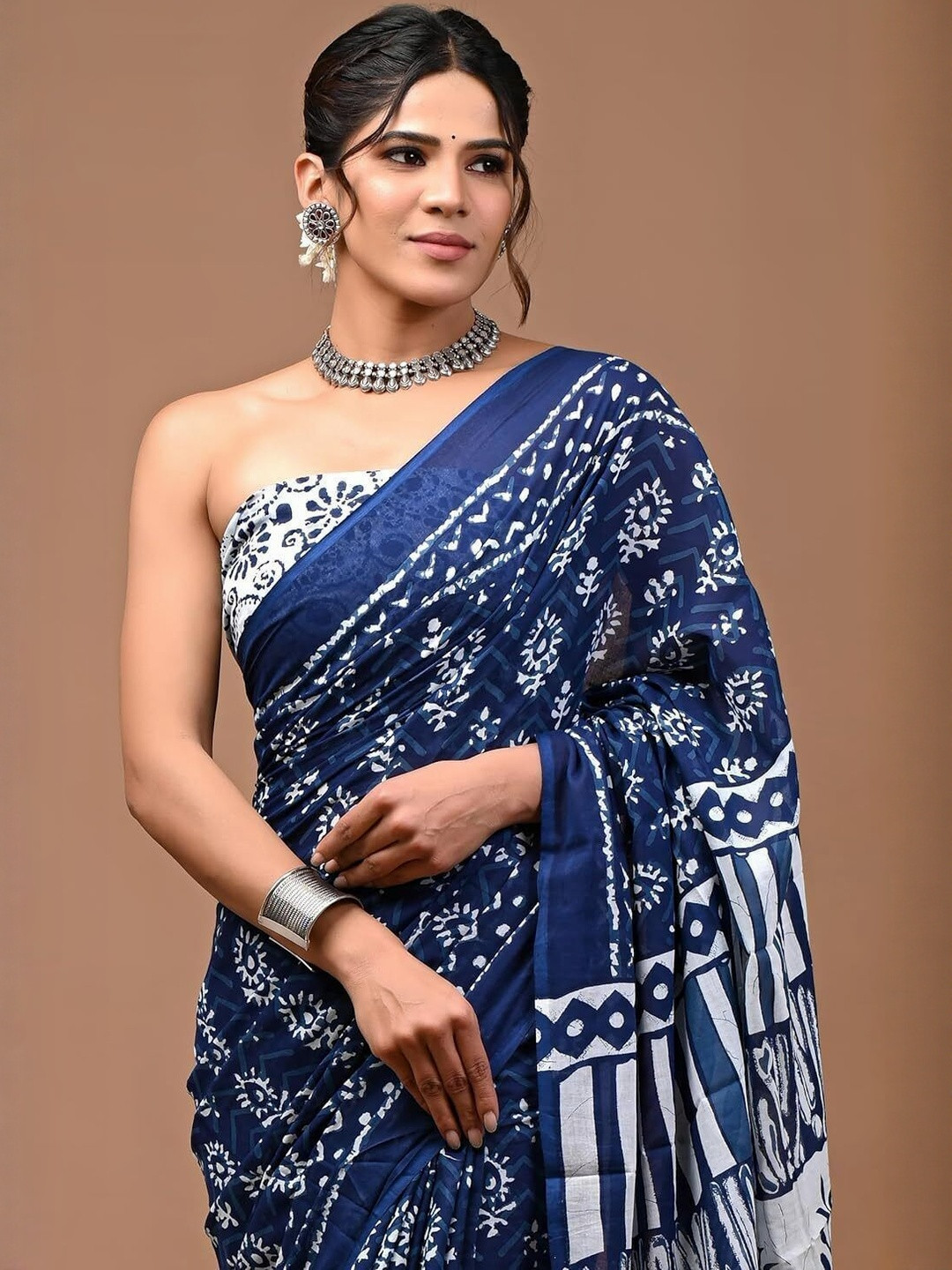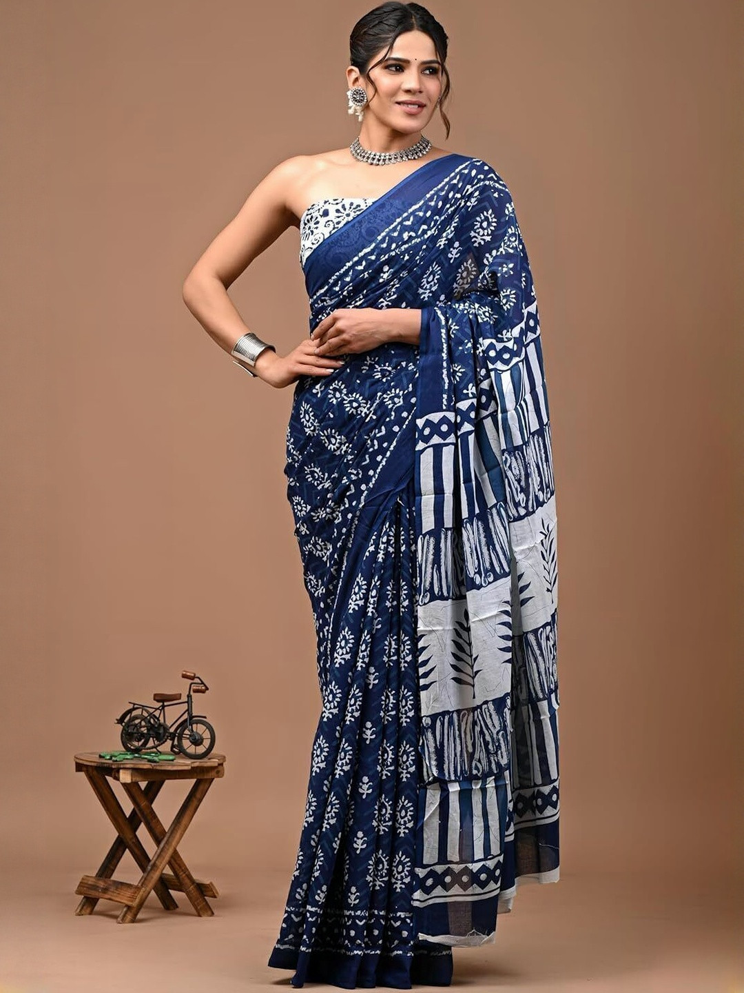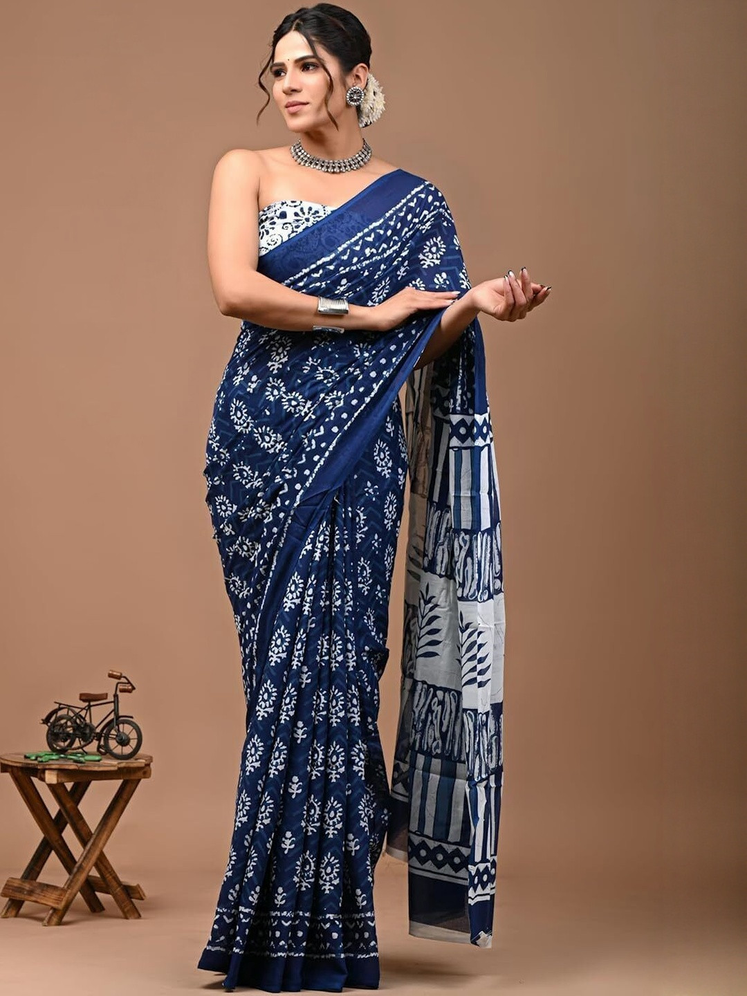 Jaimala Indigo Blue Floral Buti Block Print Cotton Mulmul Saree with Blouse Piece
