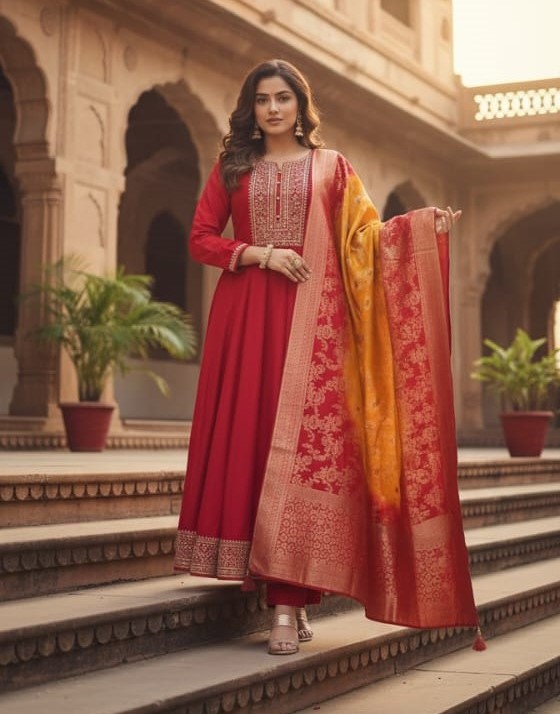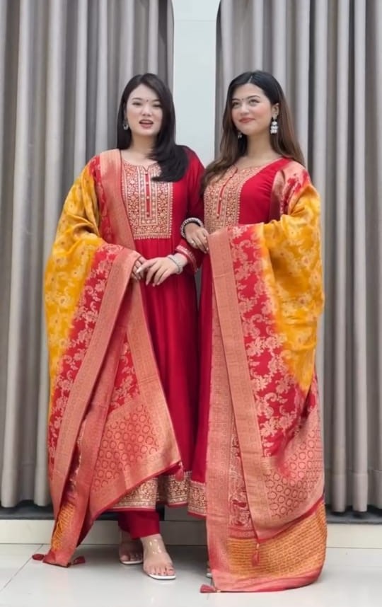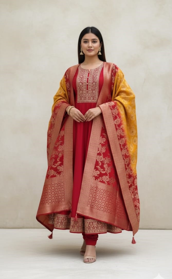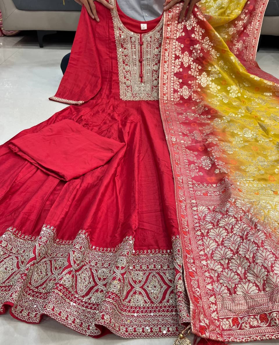 • Beautiful Traditional Golden Zari Work Anarkali Kurta Pant With Banarasi Dupatta Salwar Kameez (Set Of 3)