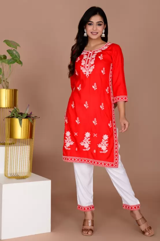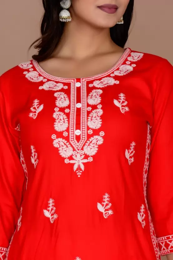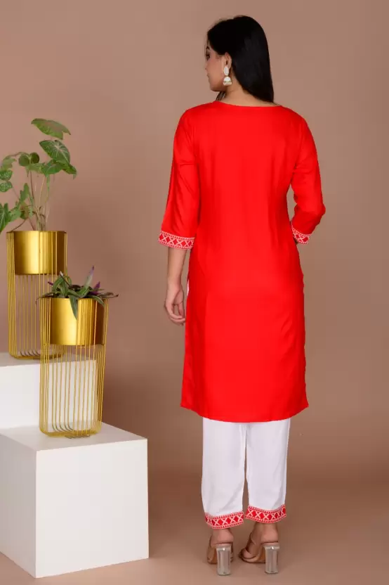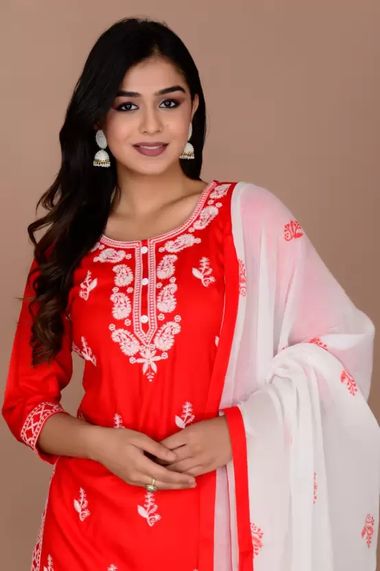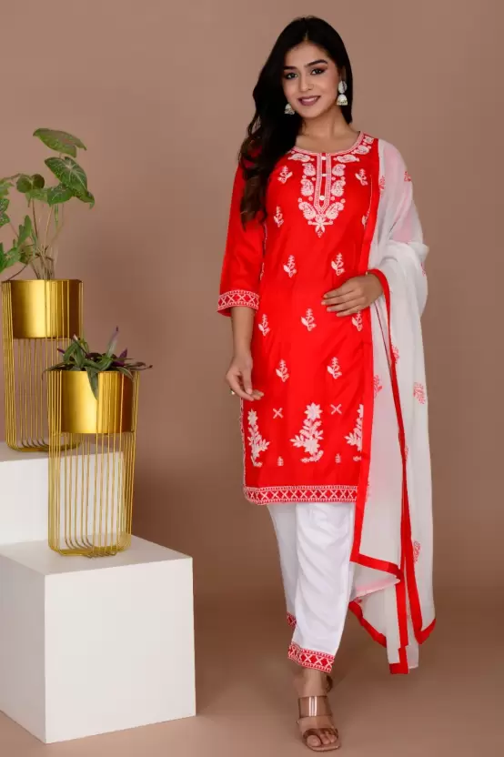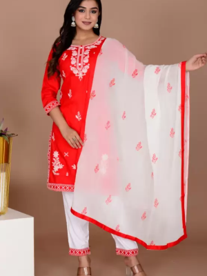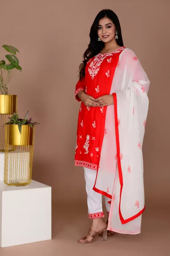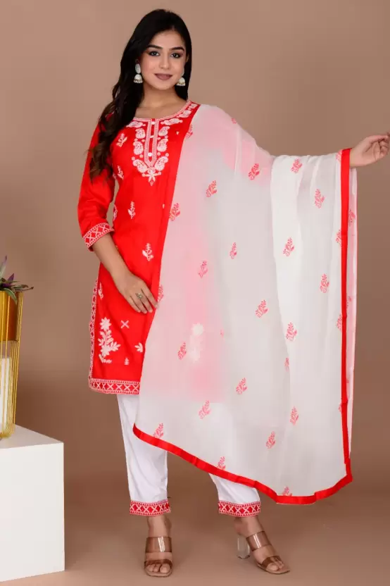 Red Melodious Embroidered Chikankari Straight Kurti Pant Dupatta Readymade Shalwar Kameez Suit