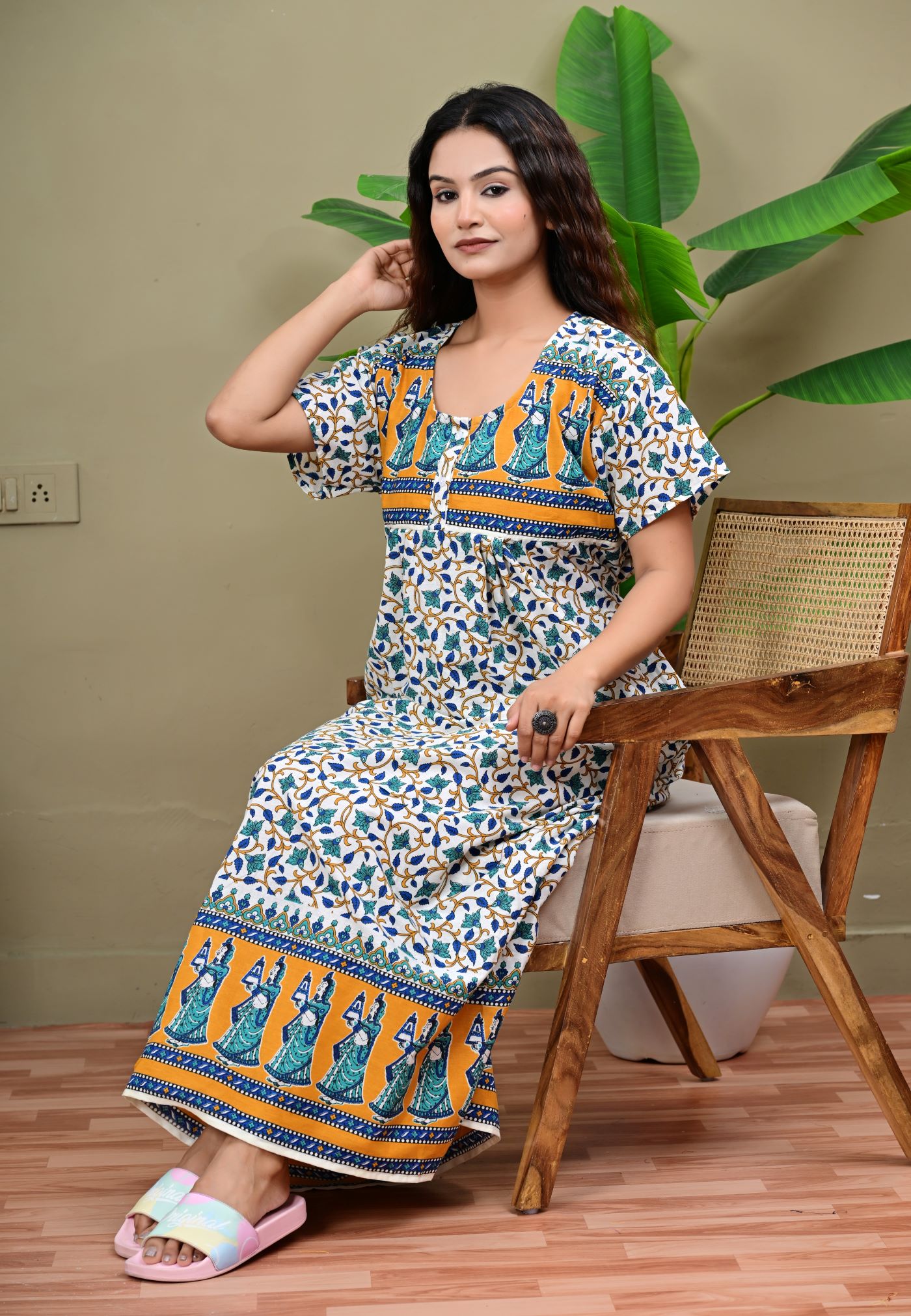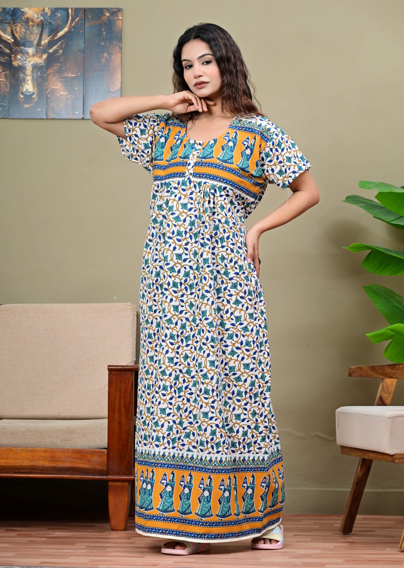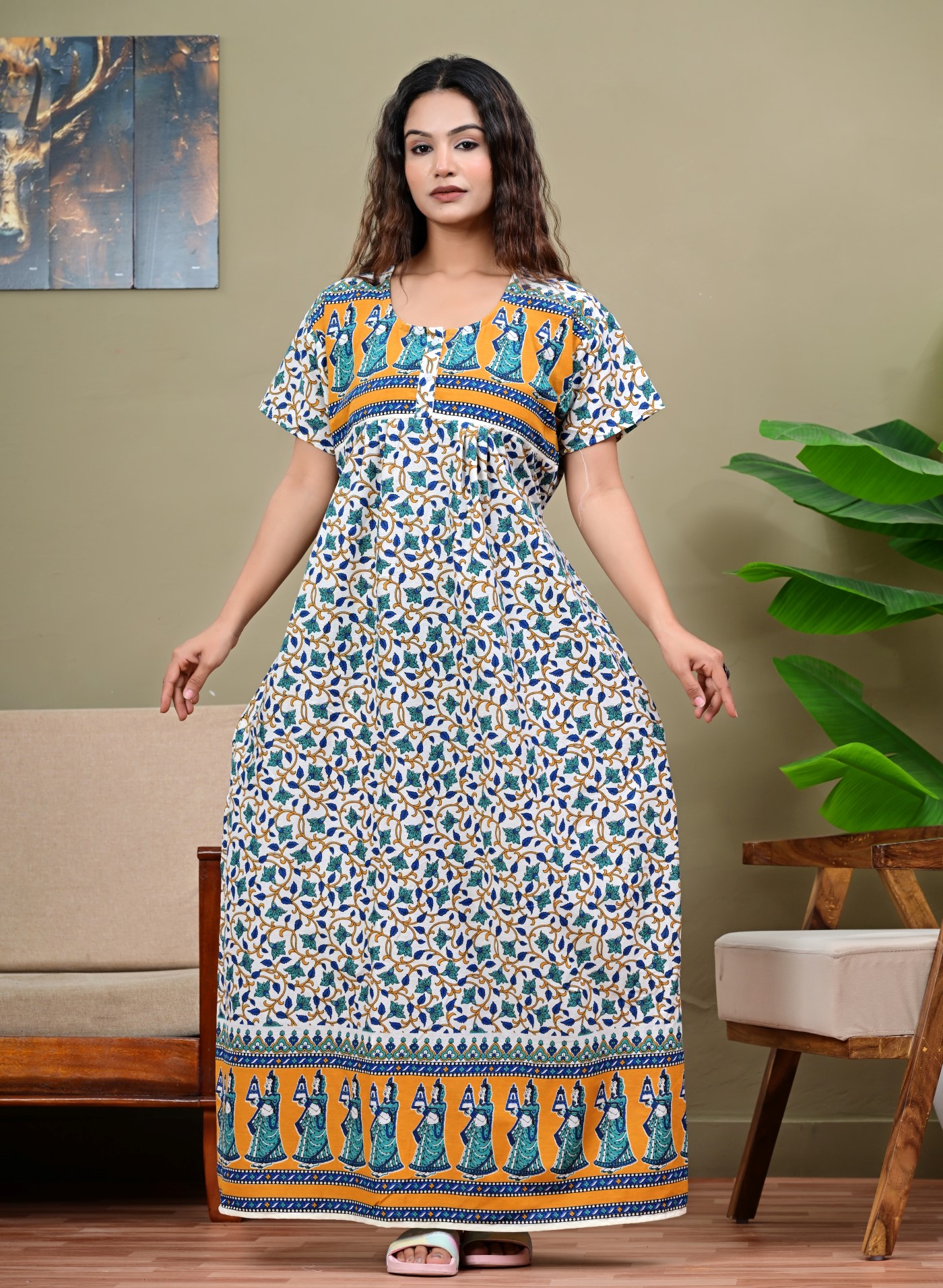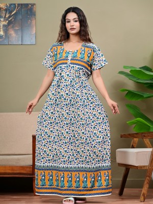 White Floral Printed Cotton Nighty Night Gown Indoor Wear Comfortable Night Kurti with Mobile Pocket